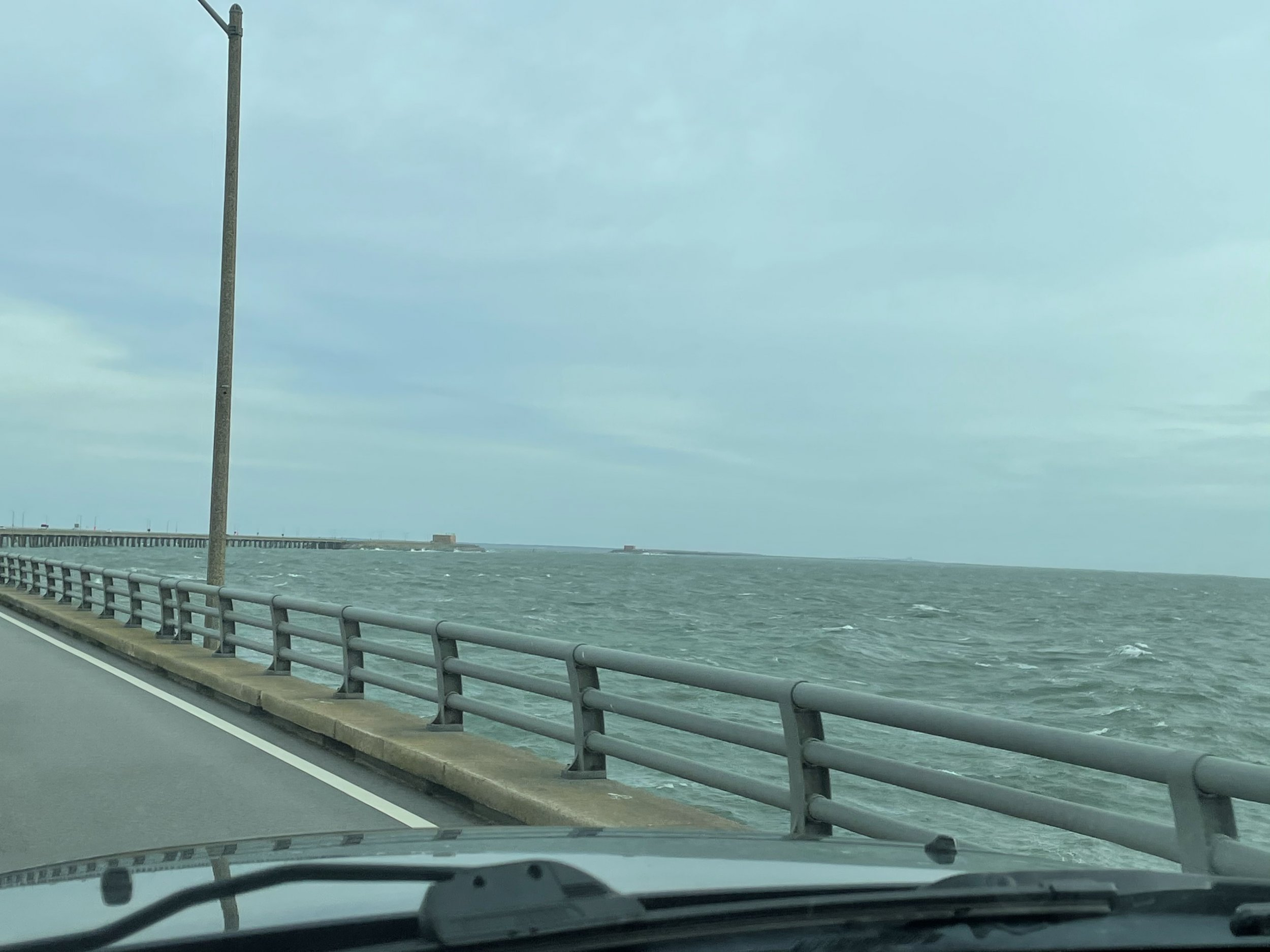 couple of pics coming across Chesapeake Bay bridge plus my favorite wall hanging in the little greasy spoon luncheonette not far from my old farm in NC.