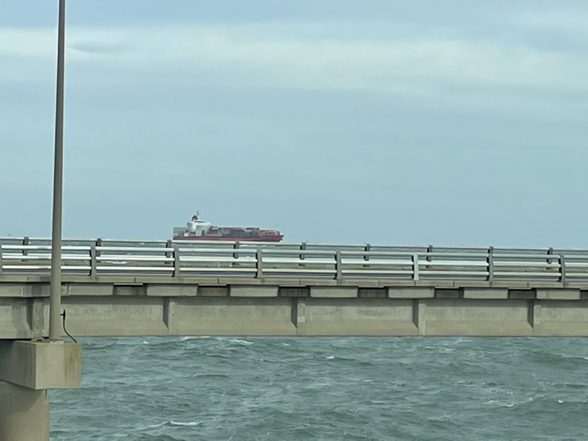 If you haven't driven over this bridge/tunnel there are two tunnel sections the big ships go through, the ship in the left pic is headed for the opening in the right.