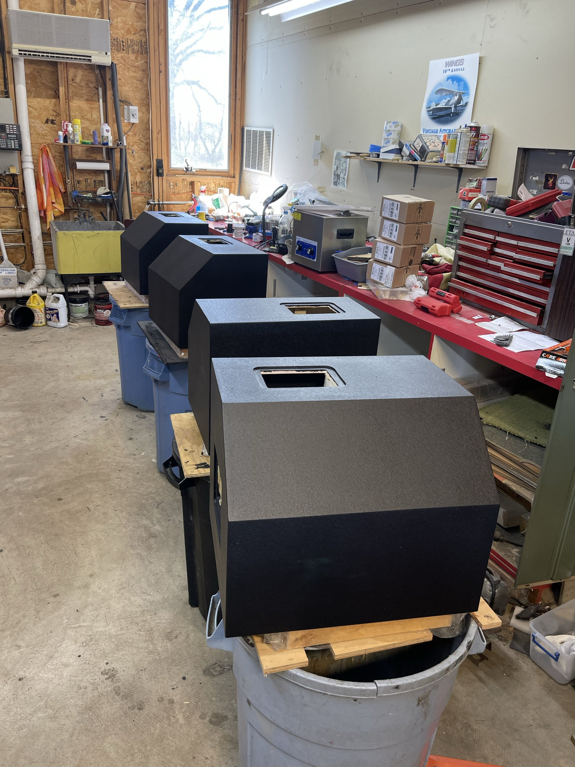 Yesterday was just about perfect weather wise. I got 5 coats of finish on the speakers, they are ready for final assembly once it cures.