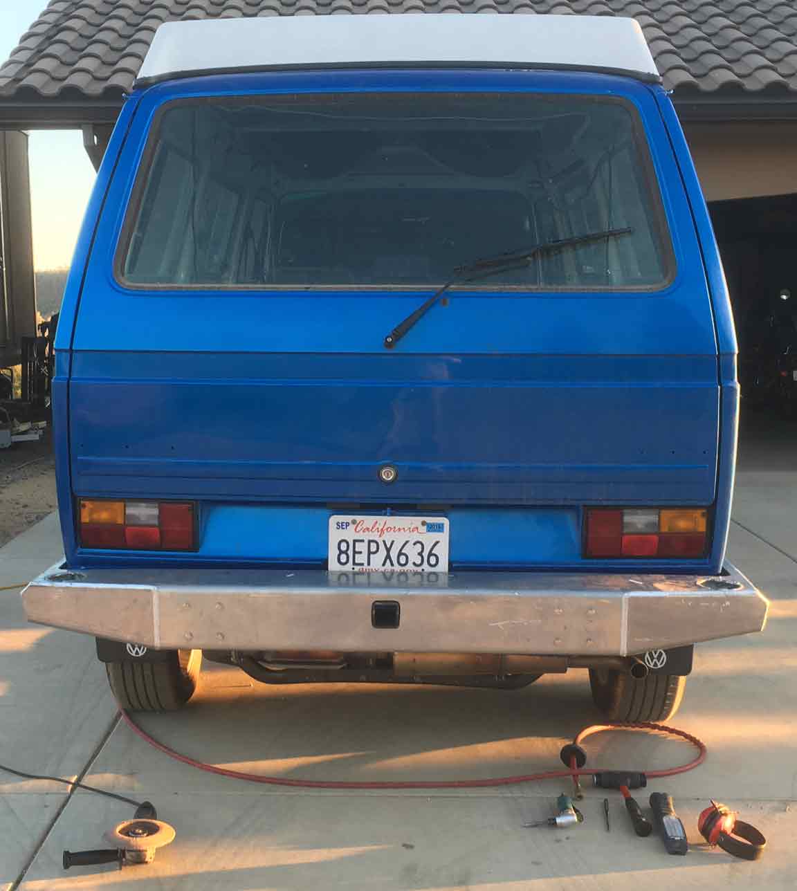 Got the bumpers out and test fit them to the Vanagon. There were no instructions or photos provided on just how that should be done, so a flurry of text messages and pics were exchanged with the fabricator to get me pointed in the right direction. Not real happy with the fit, as there are a few places where they are very close to touching the body, but a little time with the saber saw today will fix that. These were pretty much prototypes for a new line he'll be coming out with, so glitches like this were somewhat expected. The build quality is excellent, though. Heavy quarter inch thick aluminum on the outside with thick steel frame underneath. I'll smooth out the welds, scuff 'em up with the D/A sander, and shoot 'em with bed liner today.