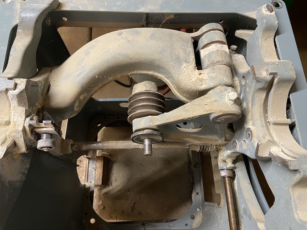 Finally bit the bullet and pulled the guts of the machine: front and rear trunnion brackets, trunnion itself, blade arbor and motor mount ... along with two worm gears and shafts:
