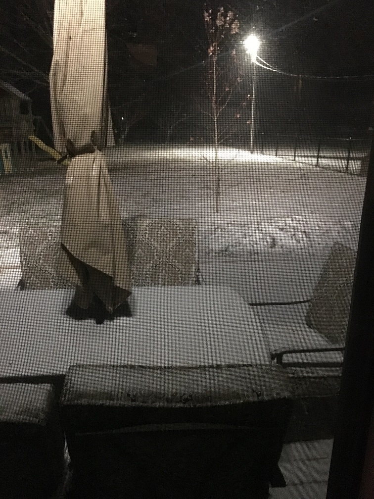 Guess I came in just in the nick of time, as it was blowing some pretty big flaked sideways. Guess they weren't kidding when they used the word "squalls." Picture through the screen isn't all that great. We ended up with about 1/2".