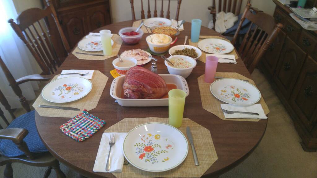 We had ham and turkey, potatoes, gravy, dressing, green beans, coleslaw, homemade apple, pecan, pumpkin, chocolate pie. She forgot to bake sweetpotatoes...1122181428.jpeg
