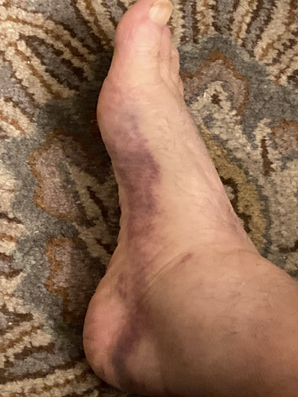 A few days after I broke my leg many years ago, Don, my foot looked just like yours. It seems blood from the broken bone and torn tissue migrated down to the foot. Hope your healing continues.