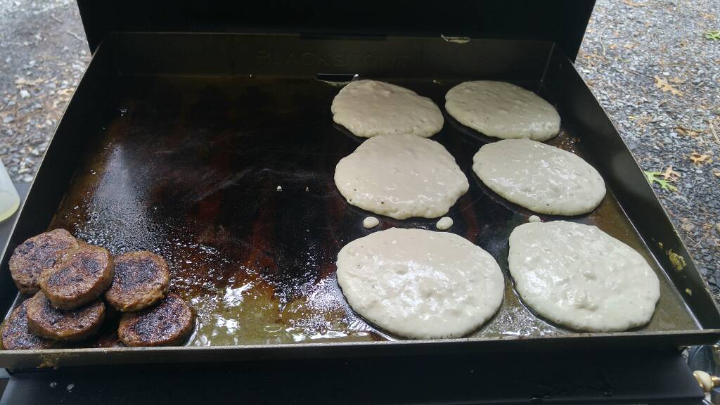 The new griddle was great while camping. Did bacon, eggs, pancakes, hamburgers, and grilled peppers, onion, zucchini on it. The latter in the middle of a huge downpour last night.