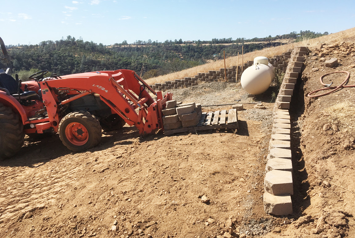 When I dug that terrace, the ground was so hard the backhoe would barely cut it. I had to raise the boom up into the air and slam it into the ground before it would bite. I would have liked to get down another foot or so, but I hit rock and had to give up. I probably didn't need to use blocks at all, but my miserable backhoe skills left the hillside looking like it got a very bad haircut. :laughing: