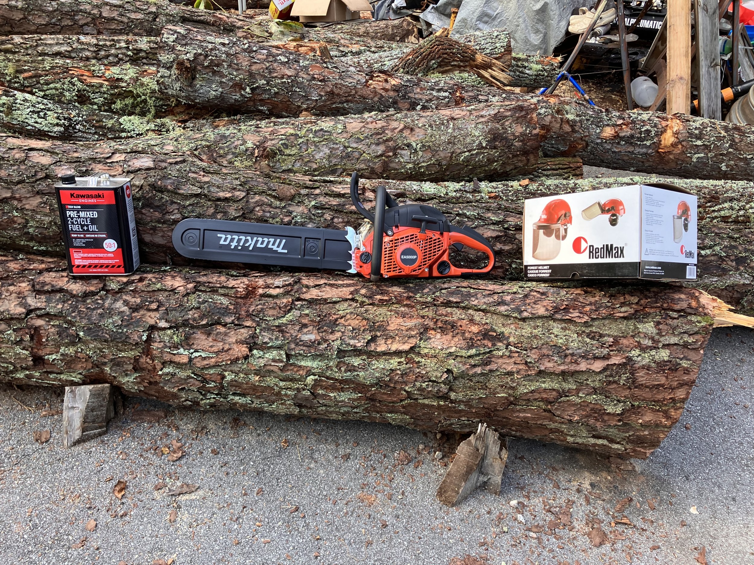 Friday, Mrs. suggested that I pick up another logging helmet so I can keep one at the house and one at the woodlot instead of trying to remember to bring it back and forth. Went to the tool shop and he had a good sale on chainsaws, so using the same logic I now have a ”big” saw to keep at the house (bigger than my little Efco top-handle, smaller than the 7300) and I won’t have to drag the big saw back and forth, either…