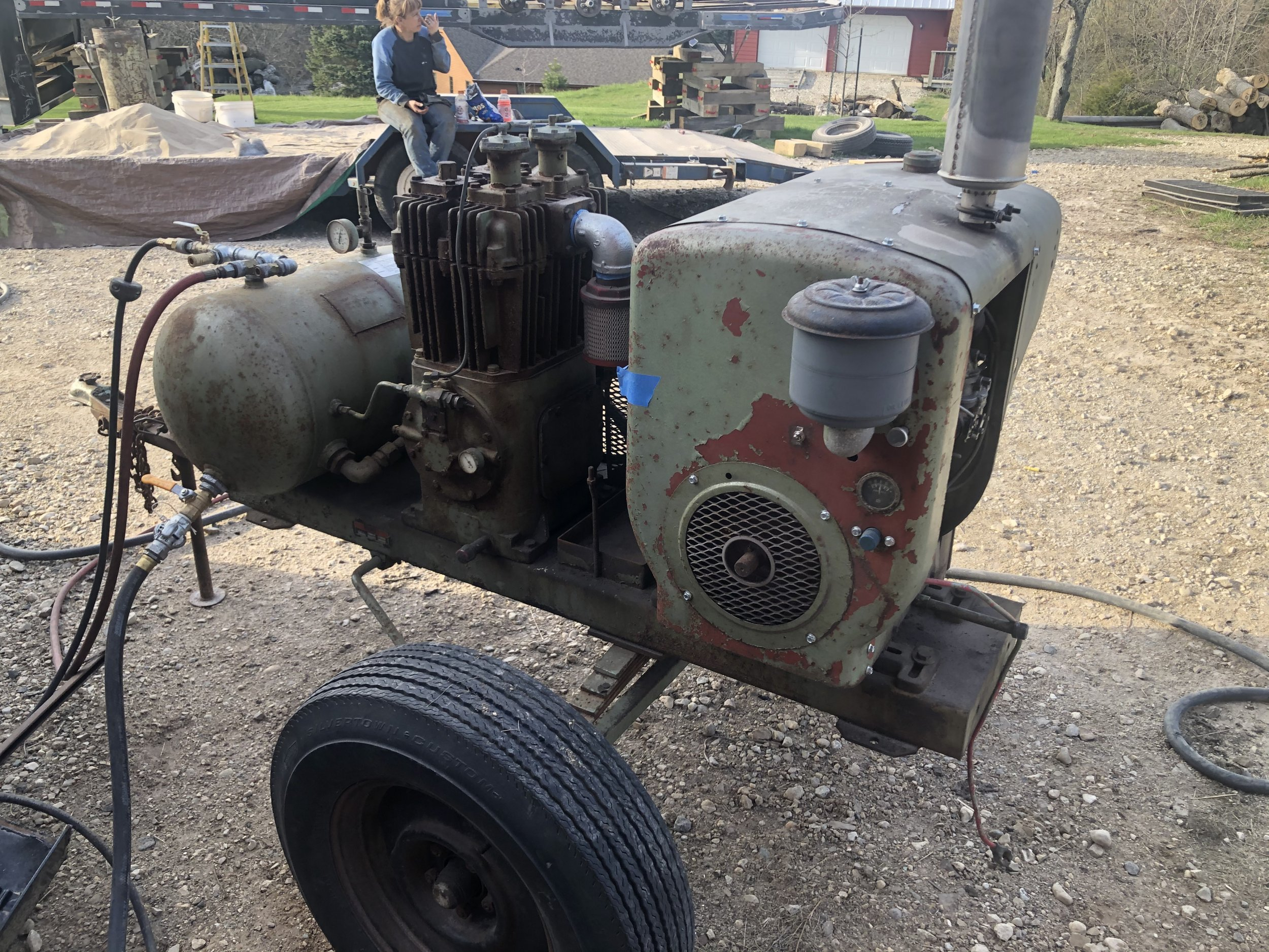Sandblasting day! A few weeks ago I bought a $100 home made pressure tank Sand blaster off marketplace. Whomever built it new how to weld. They were definitely better than I am. I then bought an old Binks gas air compressor for $200. The seller told me it would make 35 CFM. After some digging I learned it's only rated for 24 CFM. That's so disappointing because the compressor head is so big! I ended up pairing the gas compressor with my electric one. The two together were perfectly matched to hold 90psi with a 3/16" nozzle. It took a full day to strip the loose powercoat. If the coating was well bonded, I didn't try to remove it and instead tried to watch the surface so the paint the would bond.