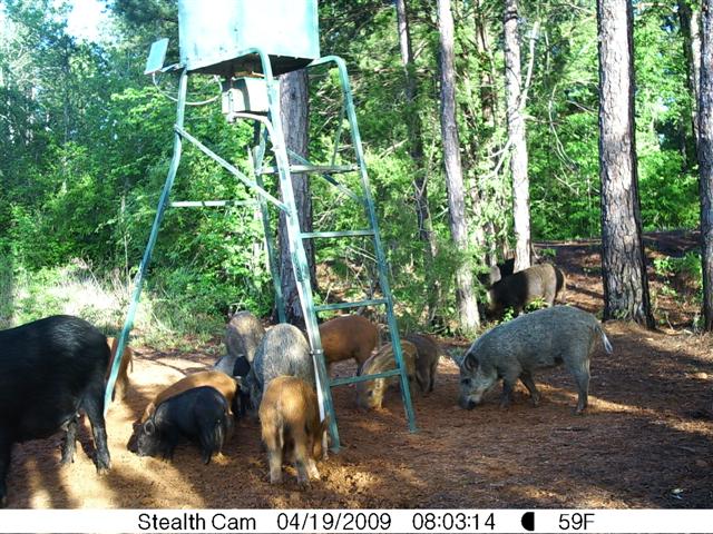 I have a feeder from Cabela's that spreads corn every morning at 7:30 for 30 seconds. I can change this to more or less real easily. I like it going off in the morning because it forces them to come out to feed after the corn is spread, or risk not getting any if they wait until dark. It works sometimes, but mostly, they wait until dark. One of the things that I really like about my feeder are the steps to get to the top of it. I had hanging feeders and feeders on tripods, but they were always a pain to fill up. This one is easy.