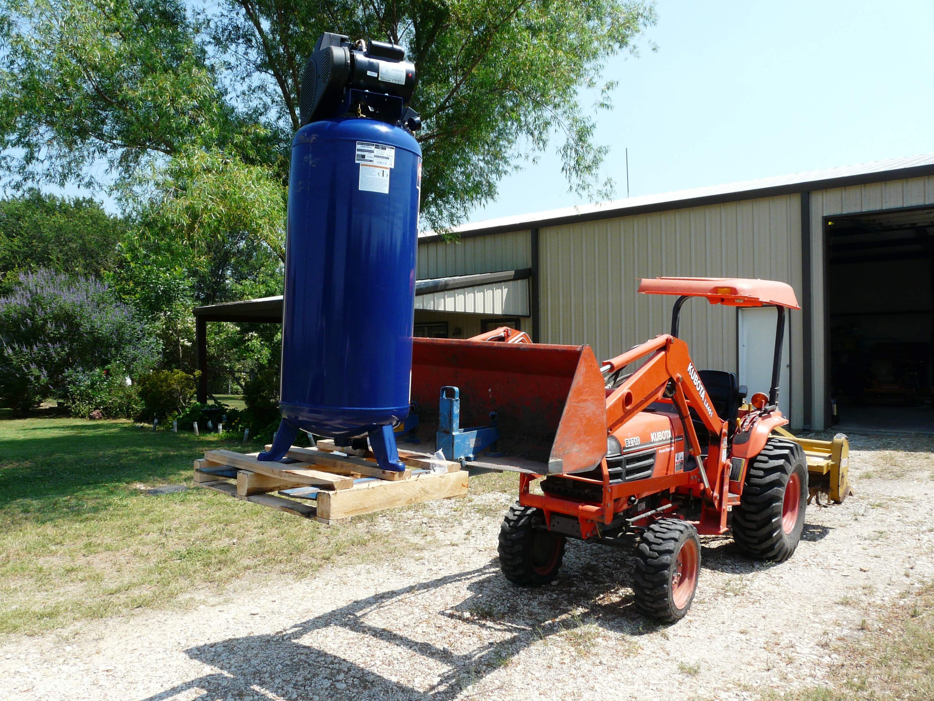Spent the day picking the Campbell Hausfeld 60 gal compressor at Tractor Supply today. Turns out they didn't have a regulator nor any kind of wiring so I had to go around town picking up everything I needed. Got it unloaded (see pics) and set up, except that I need to figure out where I am going to mount the hose spool, as its in the shop and there are no walls I can screw into and the pearlings are pretty high and not enough vertical surface to mount the bracket.