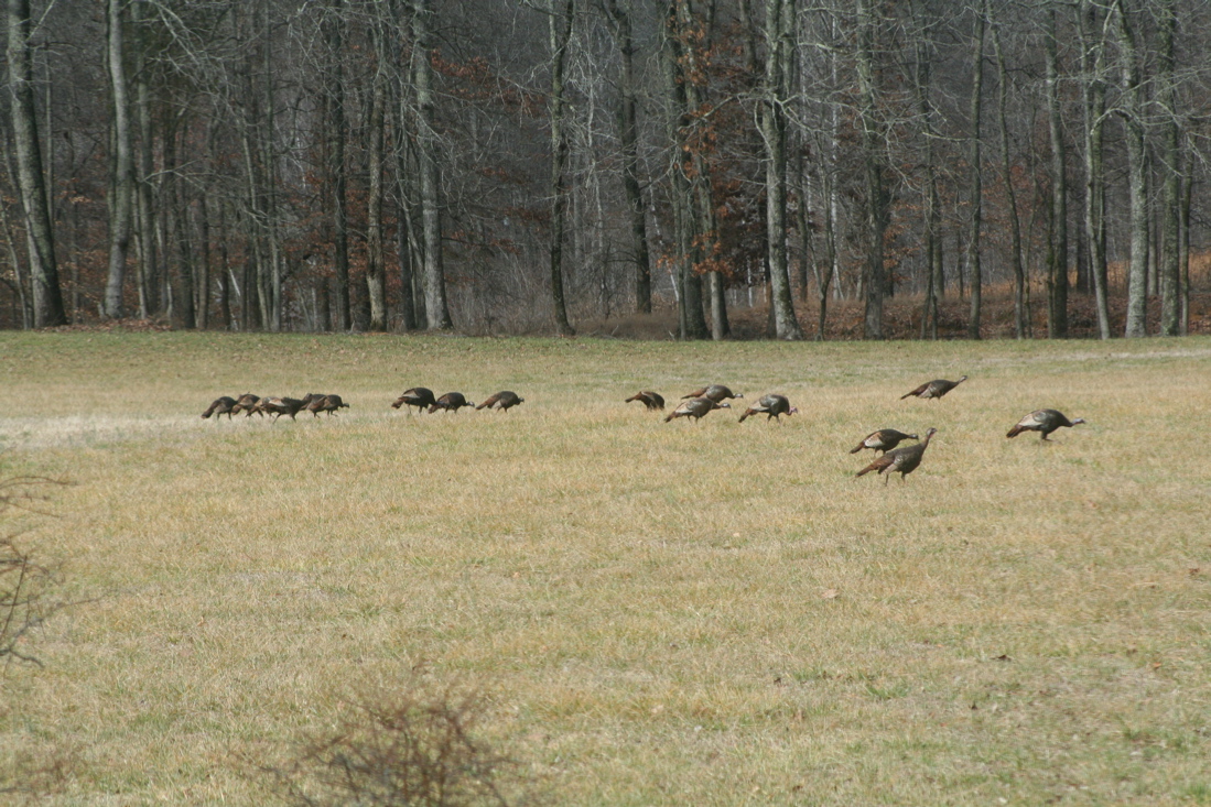 I counted about 16 of them on my place when I'm in my blind hunting deer. They keep me busy if the deer don't show up for " scheduled interveiw with 130 grain .270":D They can spot me from way out there if I'm busy working, if i get closer not giving them any attention they stay put, I can get as close as 50 yards to them on the tractor running and they don't mind it... the minute i stop the tractor they perk up and I if I get off then I see their silly commotions pulling the "3 stooges mannerism", run in to each other's path in a clumsy manner and they sure disappear real quick. They are fun to watch but with $25 Turkey permit, I'd rather go hunt for "Butter Ball" at my local grocery store.