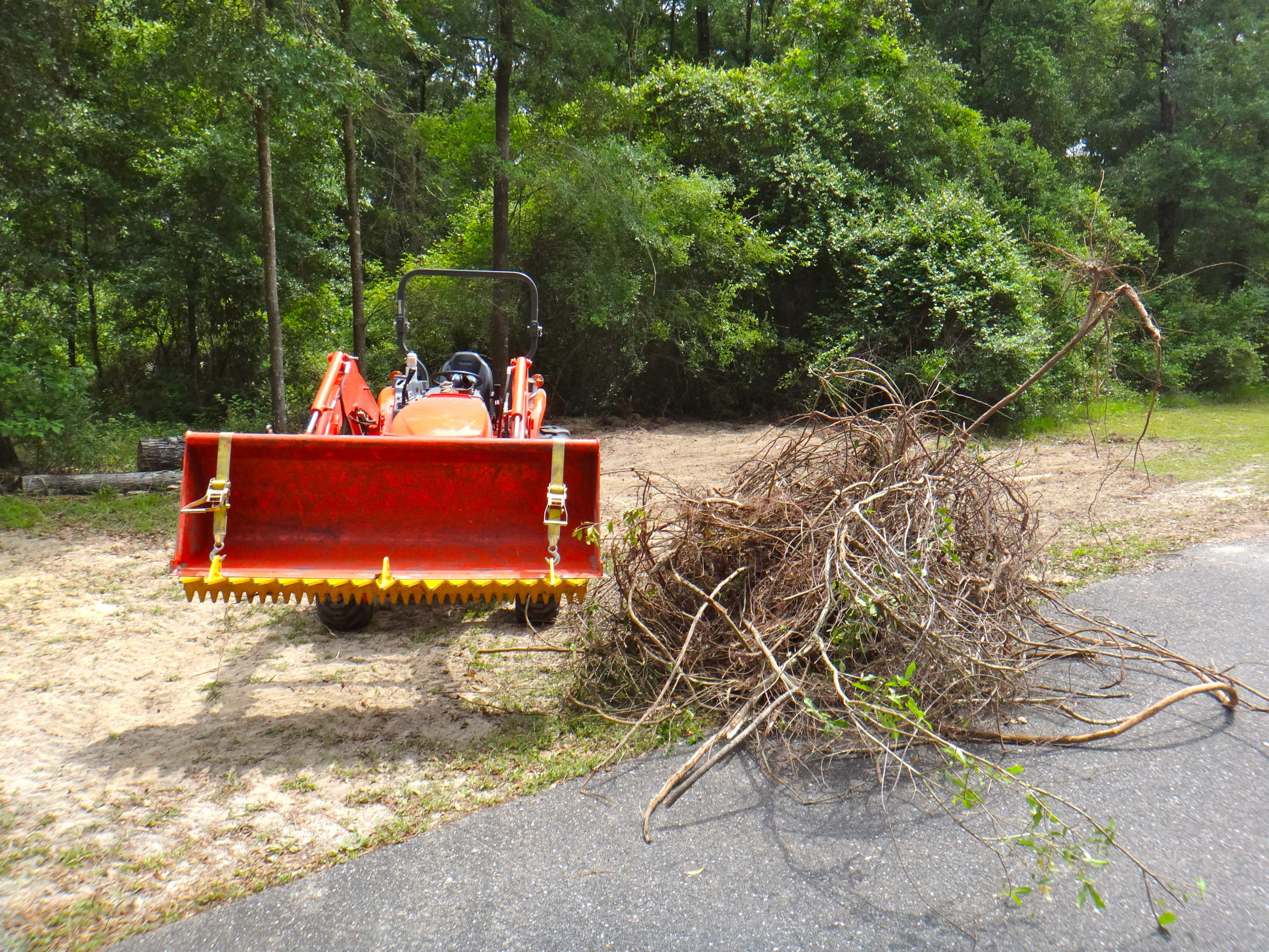When I have heavy grading to do, I mount my 60"/625 pound (125 pounds per foot) Bush Hog (brand) Rollover Box Blade on the tractor's Three Point Hitch AND the Ratchet Rake on my FEL bucket.