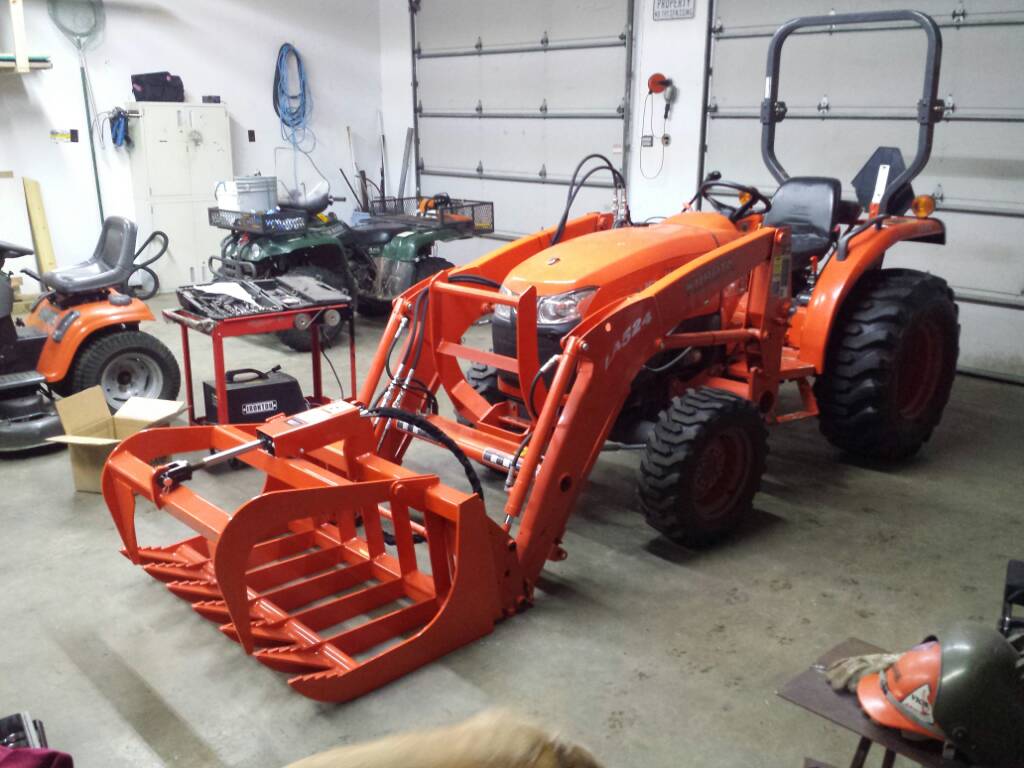 I also have a grapple and pallet forks. The grapple is the implement that stays on the tractor. I use it a lot for moving brush and logs. With the grapple I can grab the end of a log and drag it out to where I can get at it from the side. That's faster than chaining up the log and pulling it.