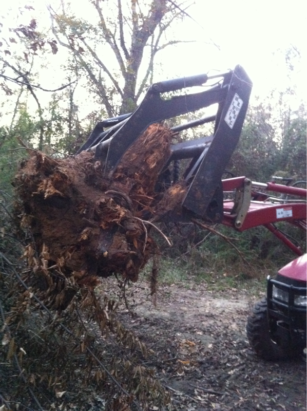 It's not quite that heavy. Actually 567 pounds (WR Long RBG 60) But certainly much heavier than a set of simple forks so cannot lift quite as much. Don't really notice the difference that much though. Here's some pics from a big pine stump we wrestled out yesterday. I apologize for not having the ropes up (Large tree limbs too low back there). Rear tires are filled and usually have 500 pound boxblade on for ballest