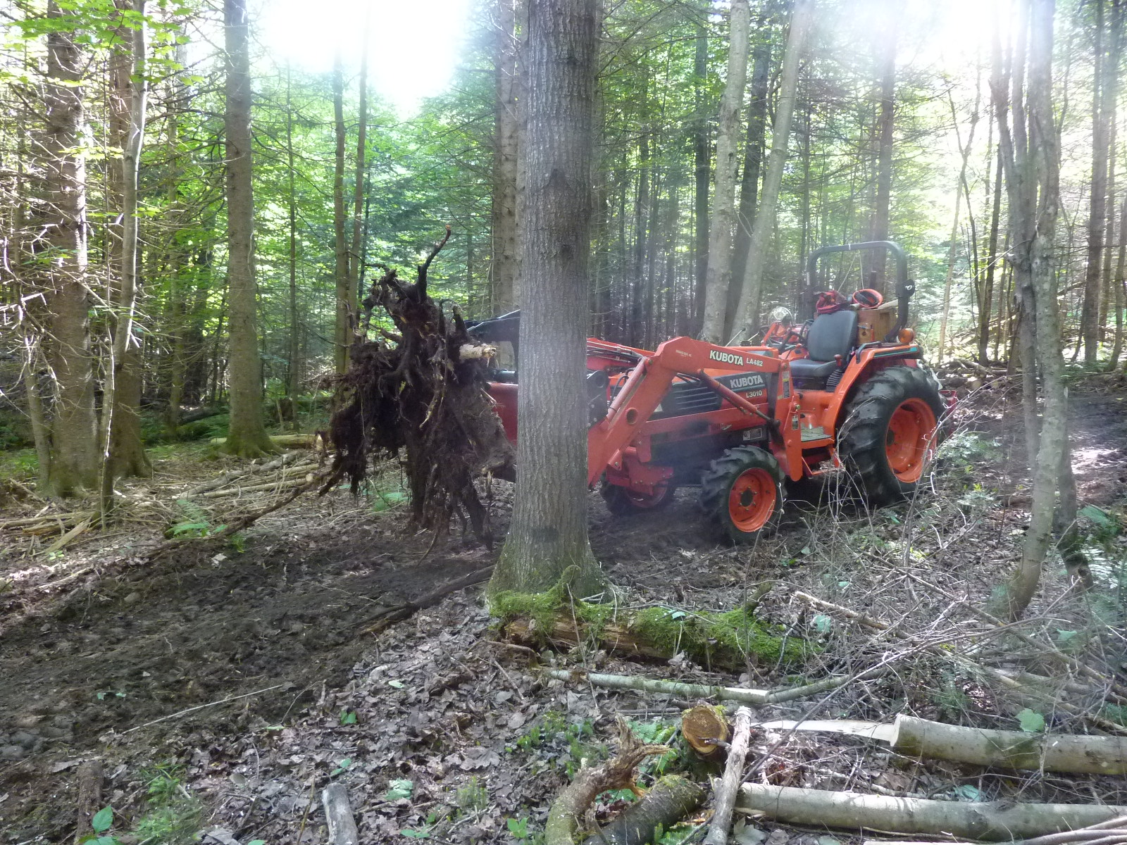 I am putting in a new woods road into an area that I want to cut this fall. I use the grapple to pull stumps and rocks and the bucket to find enough dirt to fill, pack, and level the holes that are left.