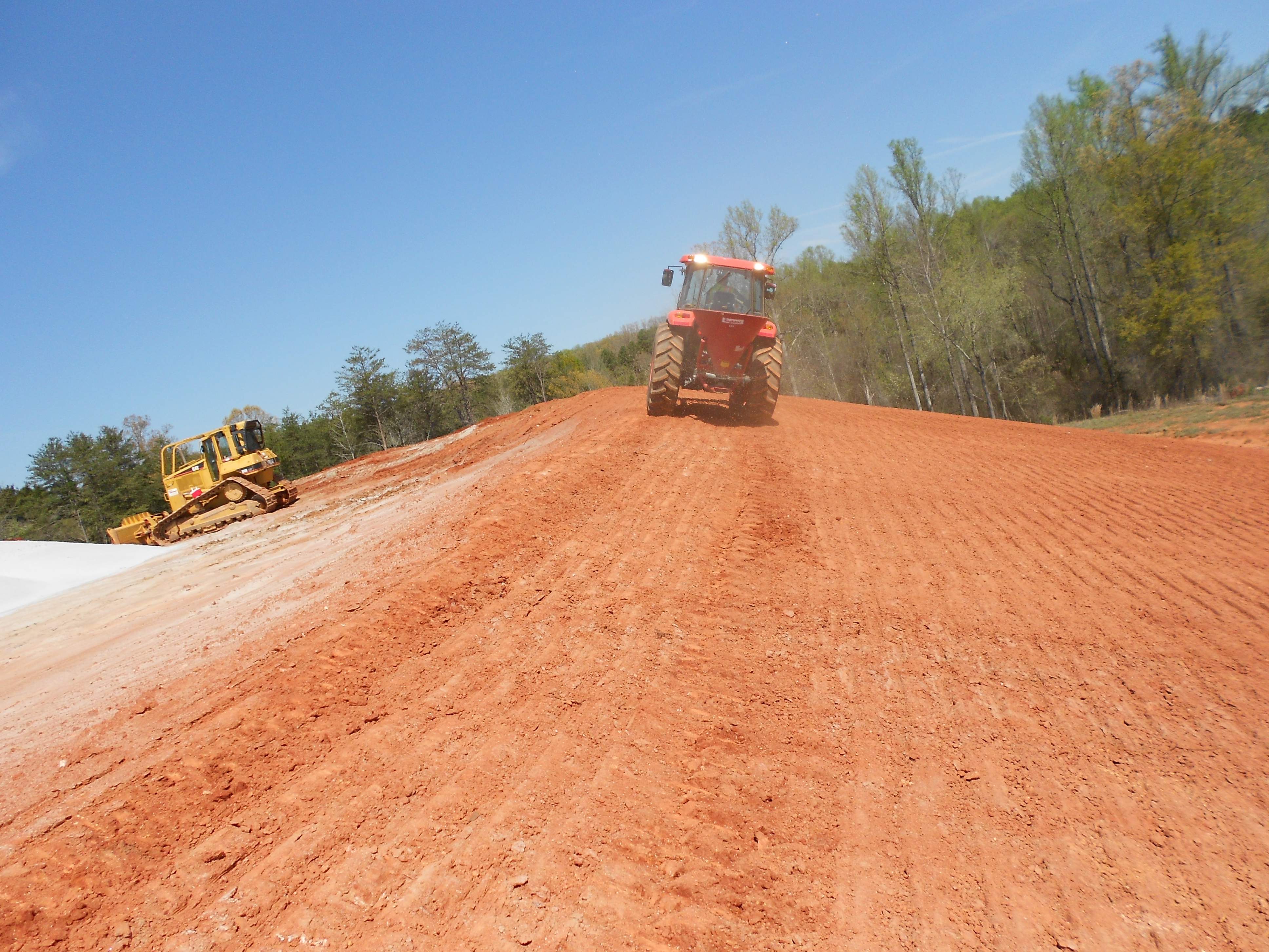 Usually use a chain harrow turned to the smooth side but wth so many steep sections of the slope it will slide down under the wheels so these we didnt drag over. The bermuda will take over the fescue and rye but this is for erosion control not grazing. Few more pics I got downloaded. Grass is starting to come up.