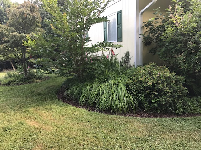 I used plastic edging and dug down on the garden side and keep it filled with at least 4" of mulch. The edging is installed based on the turn radius of the mower - no edge trimming required. Just mow and go.