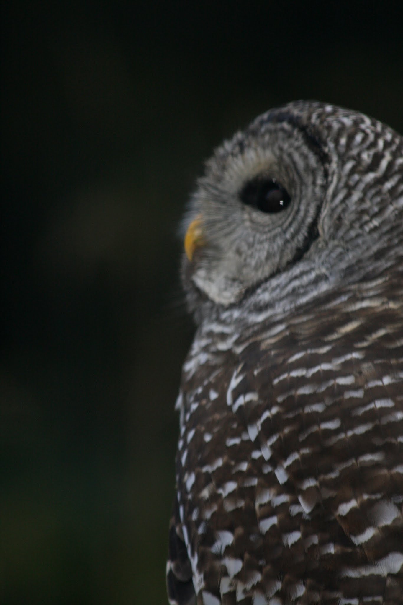 Another different kind of owl, where we are currently living. In the early morning, lying in bed, I heard, what sounded to me, like someone or something making a fairly loud whistle. I opened the window wider and stuck my head out, to see if i could figure out what the heck it was. Then i decided to slip on a pair of pants, still bare foot, and walked outside, toward the whistling, but for the life of me, i couldn't quite figure out where it was coming from. Later that day, i told my nephew about what had happened, he told me it was a young owl, probably not flying yet, calling to it's mother. He said i was lucky the mother hadn't swooped down on me, to protect the young owl. He spend a lot to time out walking around in the dark, in the woods, and told me, the first time he heard that whistle, trying to find out what it was, he saw a young owl, at the base of a tree, and an adult owl, came at him and caught the edge of his sweatshirt hood and clipped the edge of his forehead. A small but bloody cut, like scalp wounds are. Oh, it was Barred owls and we got to watch the youngster grow up, out our family room window. My wife got a cool looking pic of one, that had perched on a post, on our back deck. Here's one of them. owl.JPG