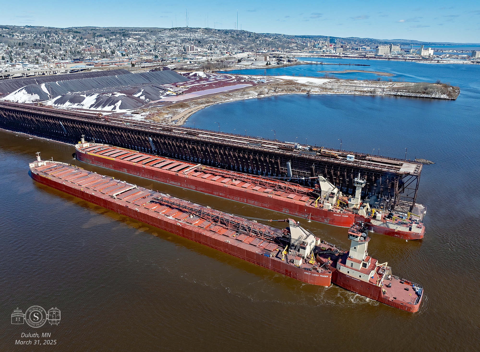 A nice view of tug/barge combos Joyce L. VanEnkevort/Great Lakes Trader passing by fleetmate Dirk S. VanEnkevort/Michigan Trader at CN Dock 6. Joyce was headed to Burns Harbor with iron ore. Duluth, MN - March 31, 2025