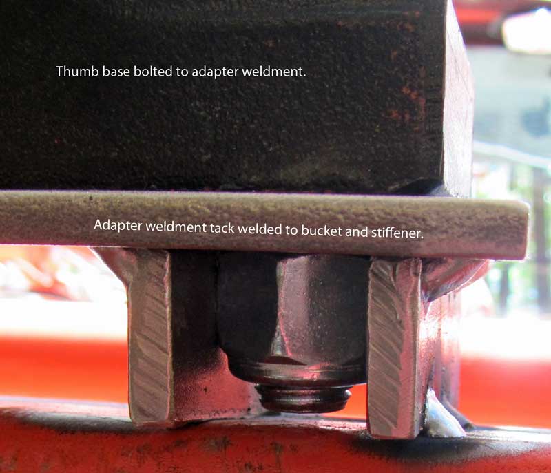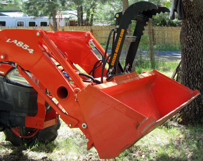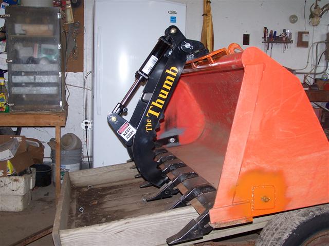 Looks like the Green Machine Thumb works well on a bucket. I recently installed a Bro-tek Thumb on my Woods hoe on a L 2250 Kubota, it works like a charm. just finished a morning of cutting logs into billets, ready for splitting. The Bro-Tek Thumb cut my work time way down. In the past I would roll a log down off the pile, position it on two cutting logs then cut each billet half through, roll the log with a Kant hook then cut the other side. With the Thumb, I pick up a 25' + log, rotate the boom, lower the log to waist height then cut the billets. If you have any type hoe, go to Bro-Tek: Tractor Add Ons and check it out.