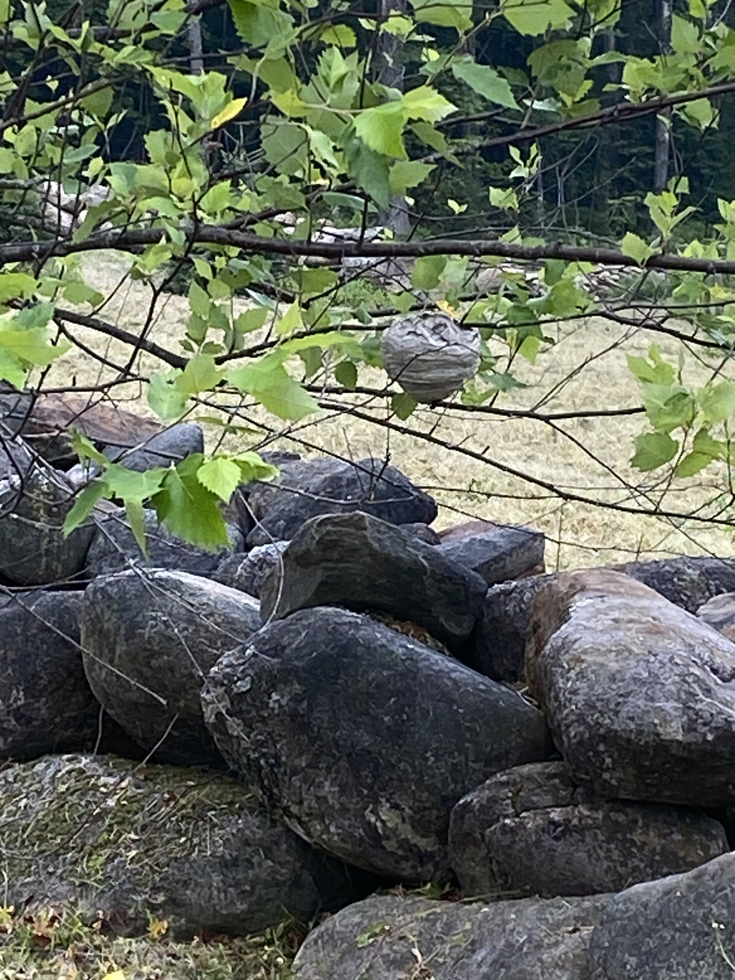 Was weed whacking along a stone wall, wasn't a ground nest but a paper wasp nest in a tree that I bumped with my forestry helmet, that didn't impress them one bit !