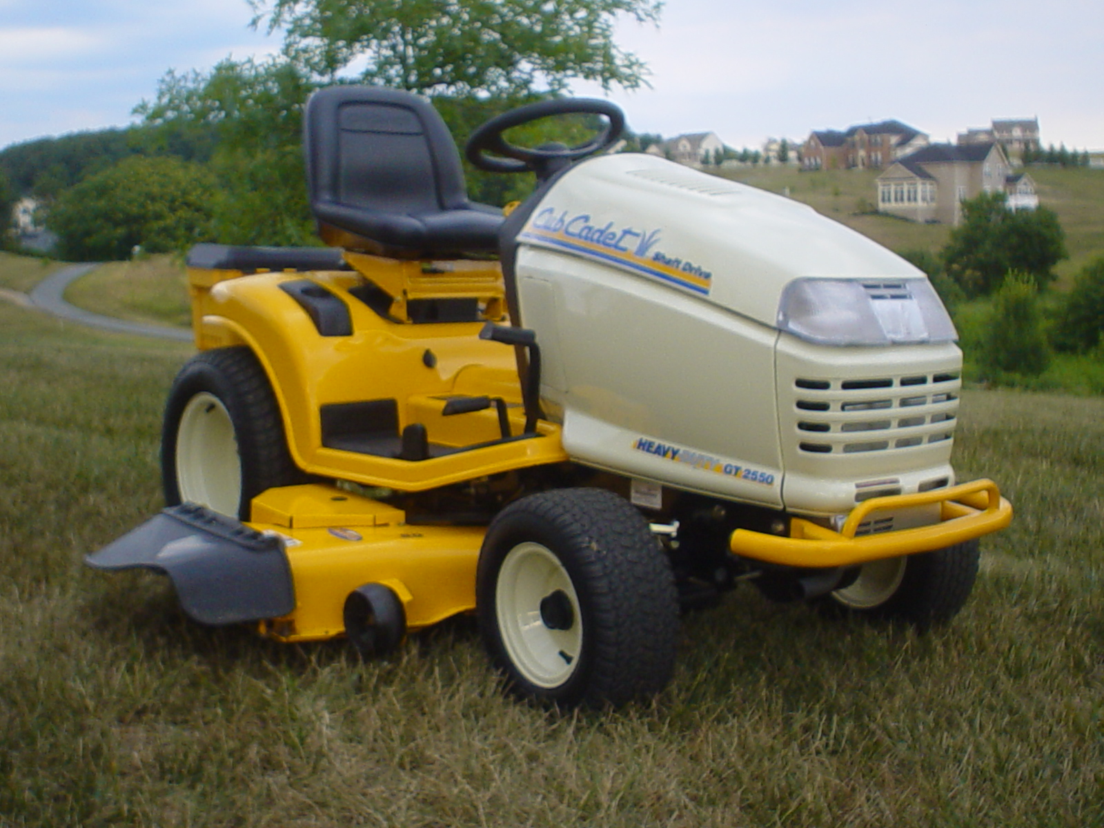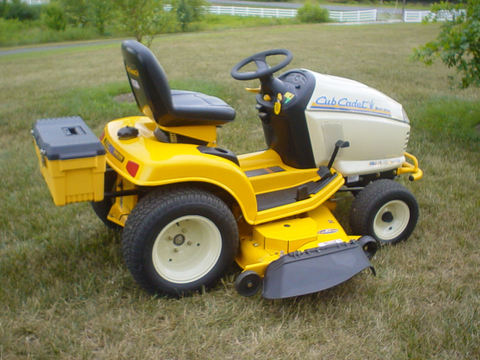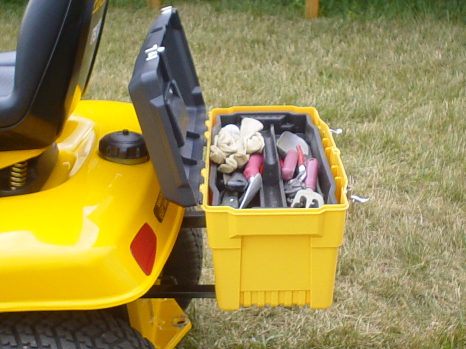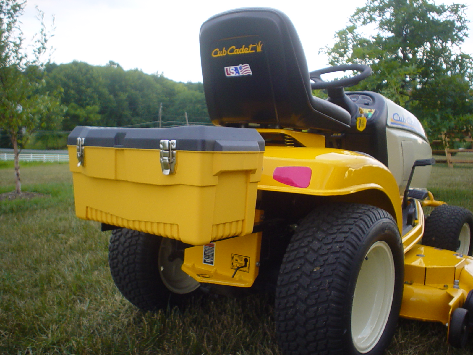 In an earlier post I mentioned I had added a Drainzit oil drain valve to alleviate the PITA factory oil drain valve. Someone asked for a pic so I thought I would post a couple of pics of my 2005 GT2550 with some minor add-ons. They are; a tube bumper I found at my dealer in his "barn" in the back of the store, a drainzit oil drain valve, a switch for the lights, and a toolbox I picked up at TSC. Last pic is my college student son.