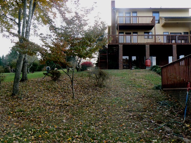 The second pic is standing behind the house looking up to the driveway. This gives you an idea of what I'm looking at. You can also notice another drain spout on the left top corner of the house, with the downspout coming literally right behind the stairs up to the second deck.