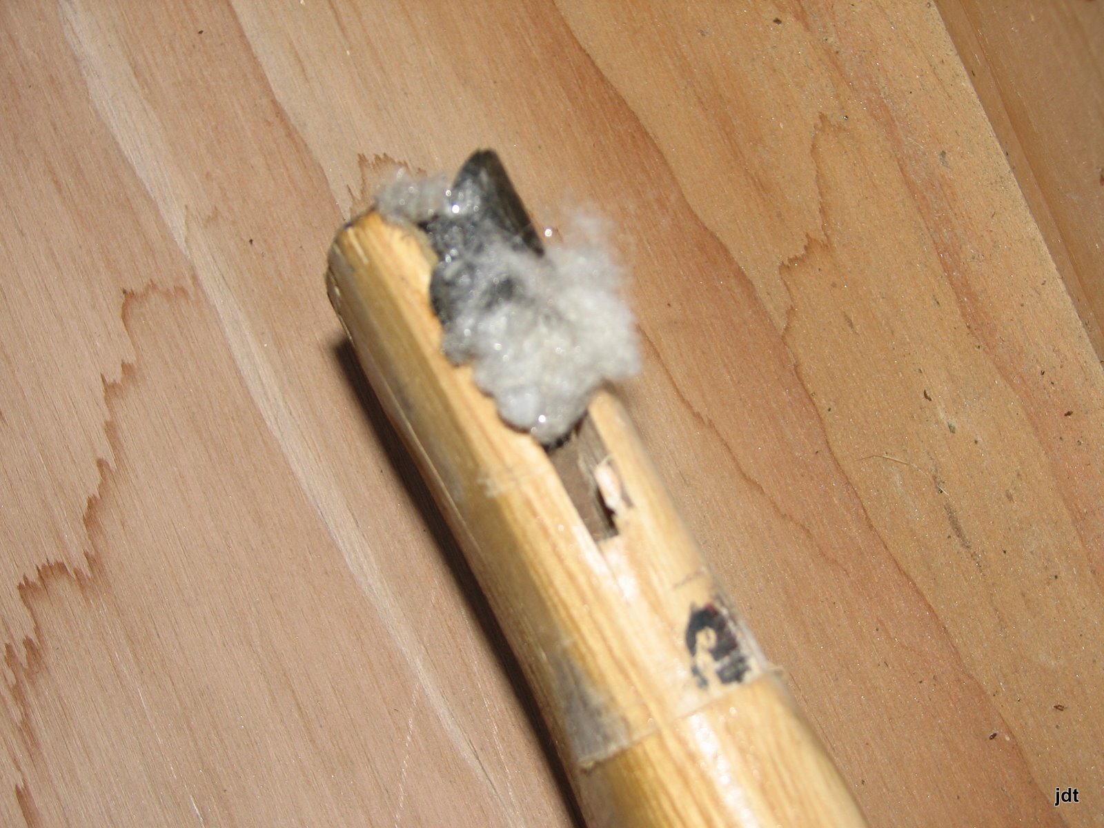There was a little blob of black resin in there, and a bit of ... fluff ... of unknown composition. No wedge at all, just a hollowed out shaft stuck in the heavy axe head waiting to drop it on my head. Takes serious talent to screw up an axe to this degree.