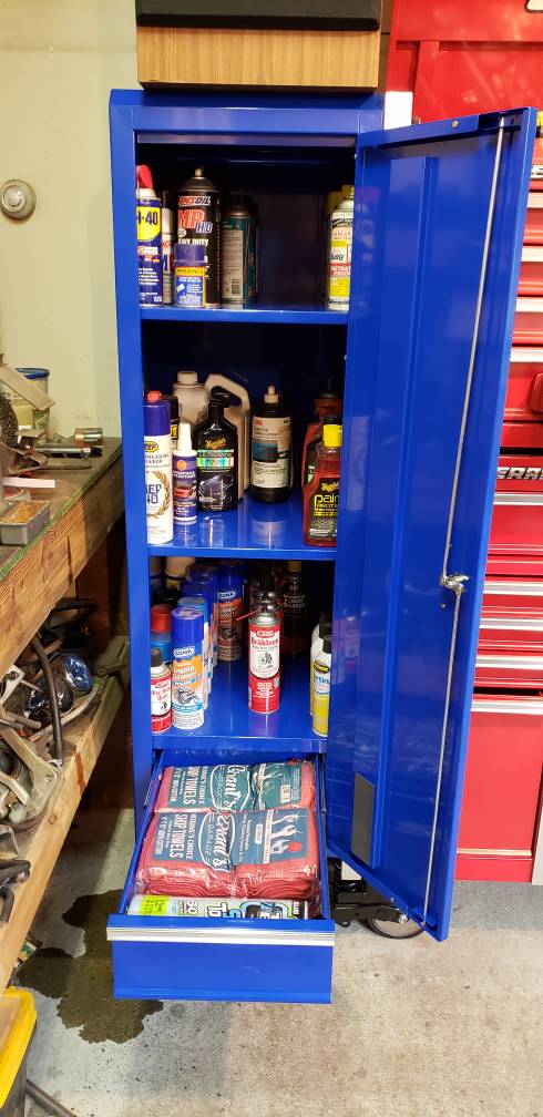 Bottom shelf with all of your electrical cleaner, brake clean, engine clean contact cleaner, terminal sealer and other similar stuff.
