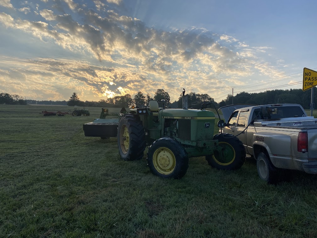 Friday went like this. Last minute decision to mow. At field mowing by 7am. 930am uncle takes over, go to barn load hay for customer. Swap implements on tractor head back to field. Start raking. Sit on raking tractor from 1030-2pm. Back to barn and get square baler hooked up. Grab a granola bar. My first food of the day. Go back to field and bale until 4pm. Finish raking field. Go back to baling. Wife shows up to bale I switch over to grapple tractor. At 730 i am backing wagons into the shed.