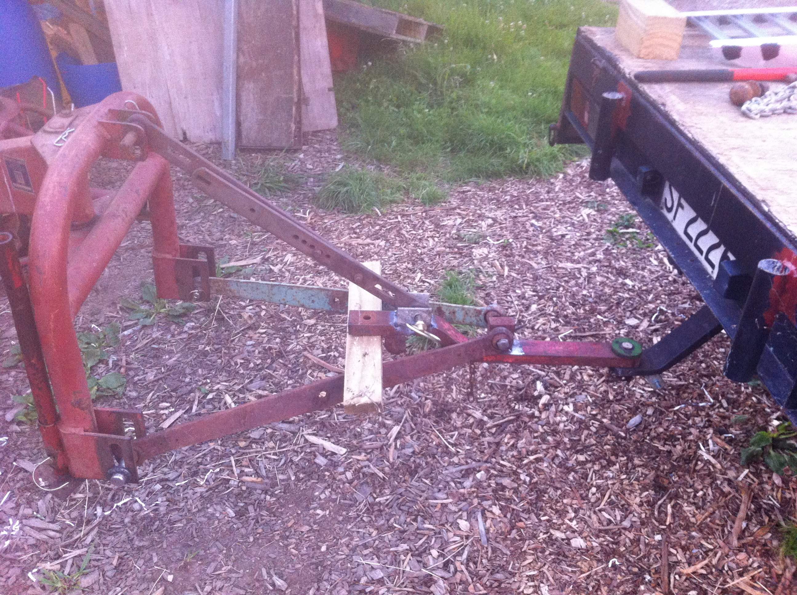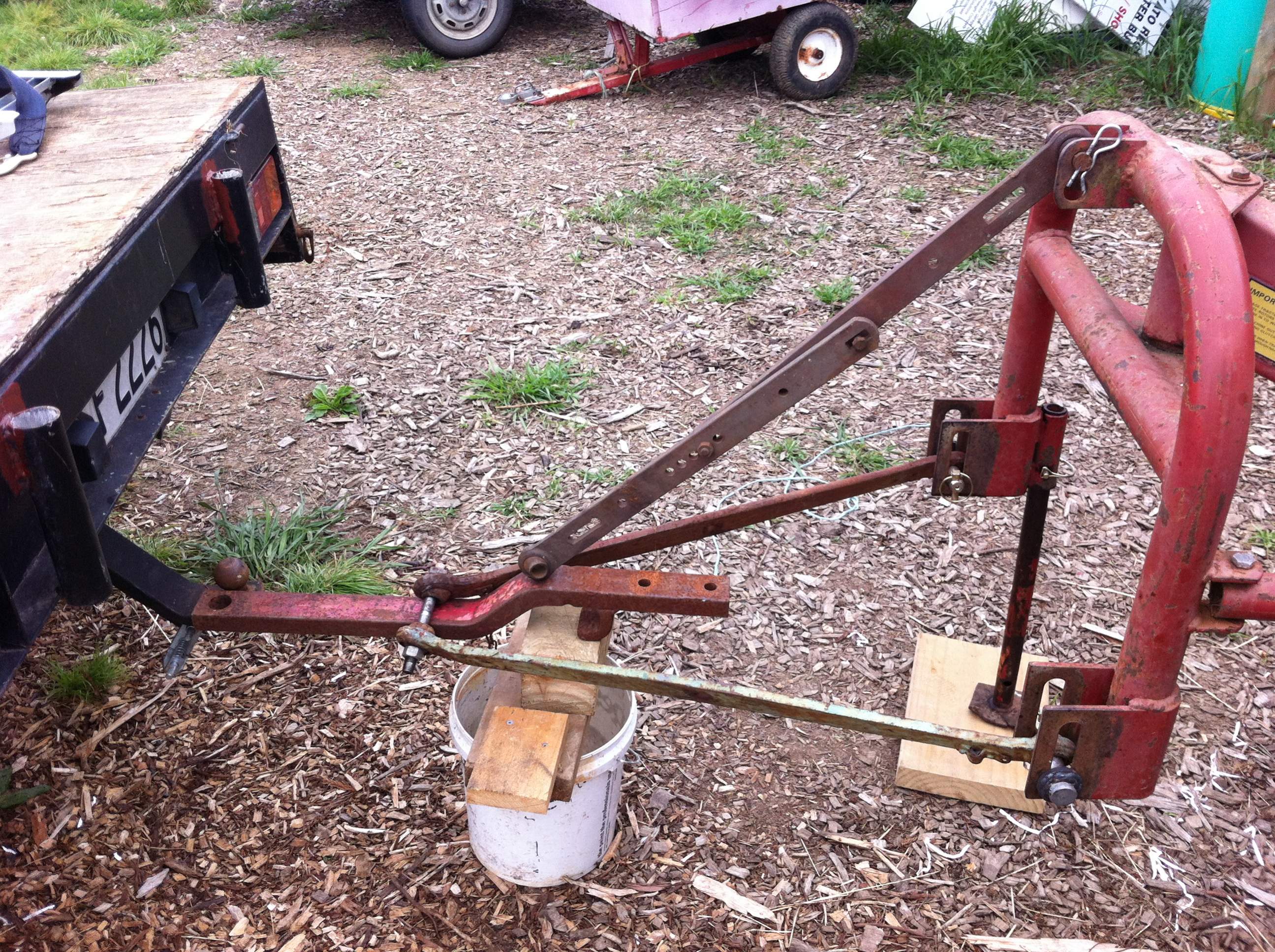 Forgot to mention, it's made from 2 x plough arms off an old Fergy, a scrounged top link and an old drawbar off an International 434. The small piece of vertical steel the plough arms fit to was chopped off the end of the drawbar and the two small pieces of galvanized steel that the top link fits to were chopped off the end of some old power pylon steel angle sections.