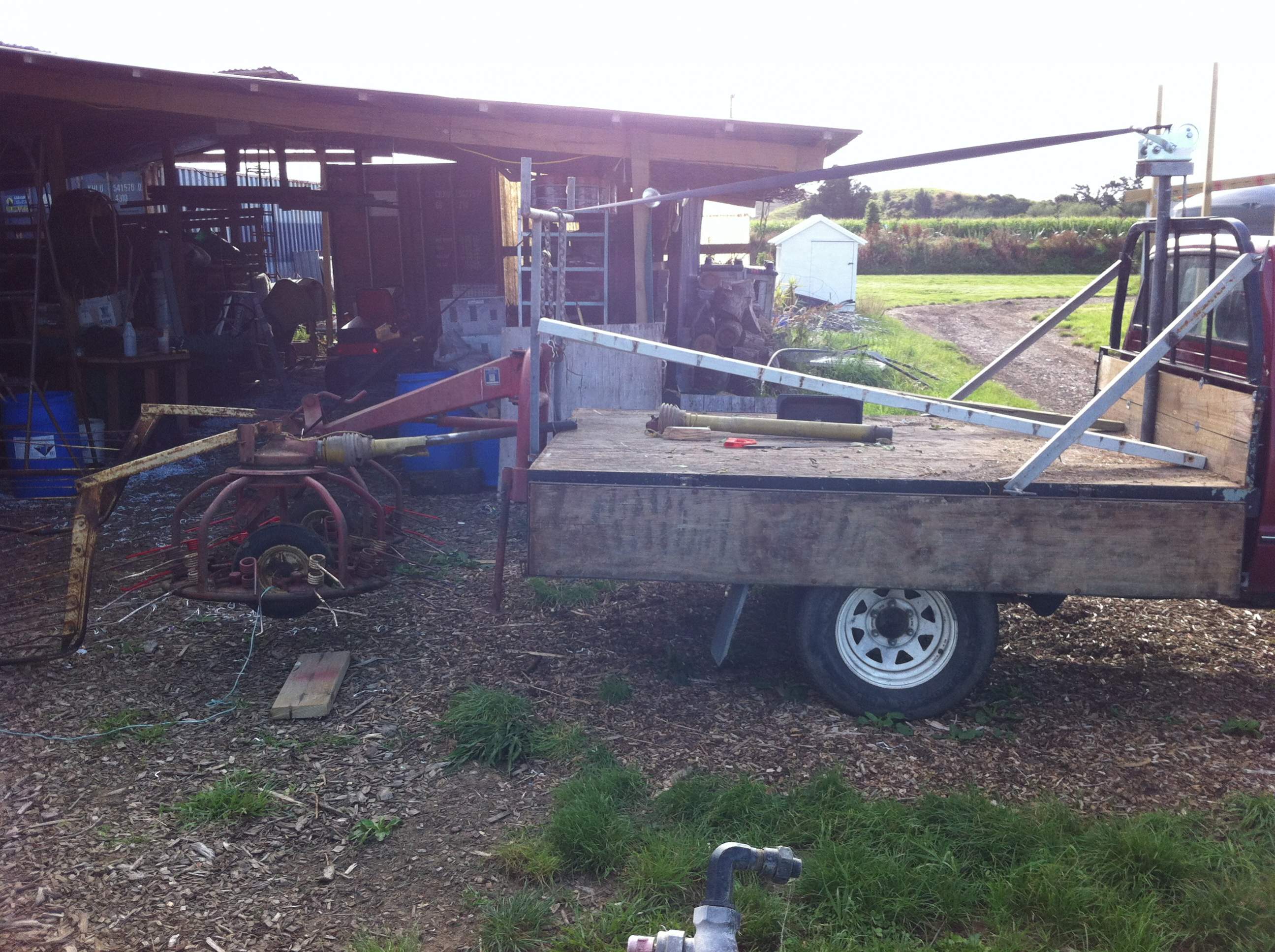 The first photo shows my failed experiment to hang the rake off the back of the ute by winching it up and chaining it on. Failed miserably.