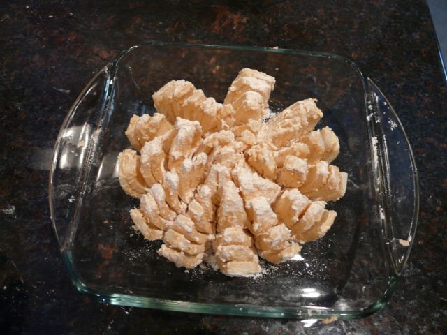 Just yesterday I got the biggest onion from our garden and made a fat free blooming onion here is a picture of it battered before it went in the oven for 50 minutes at 375 degrees. I did not think about the baked picture till after I ate it - oops.