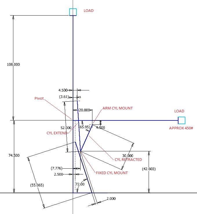 You're looking at the load in two different positions, horizontal and vertical. I've got the vertical fixed mast and angle brace which has the cyl mount on it. The dimensions in parentheses (x) are being solved by the sketcher, and I input the rest.