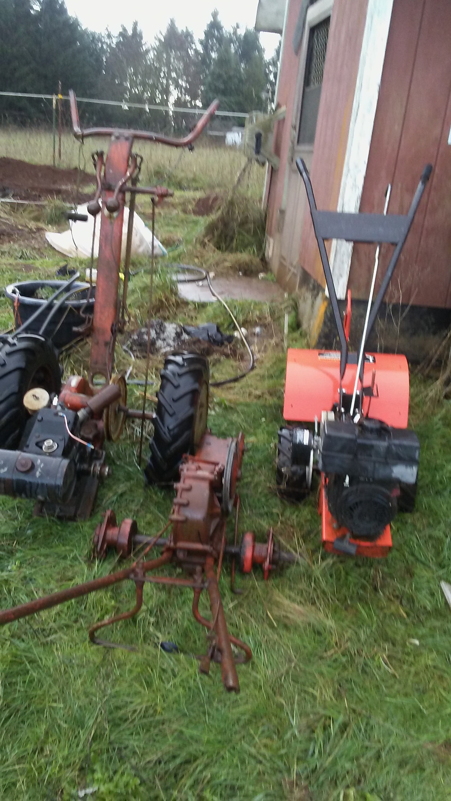 Looks like a Simplicity Two-wheel tractor. Mine came with a sickle-bar mower, reel mower, cultivaters, plowshares; single and double,and a front blade. All this crap is still kicking around here.