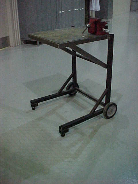 Here's a pic of my portable welding "bench". The wheels allow me to move it where I need it, the vise is small, but will hold pretty much anything I need long enough to tack it or weld it, the rubber feet on the front legs keep it from moving around much. It's fairly light duty, but then so are most of the things I need to weld on it. I've found it really handy tho.........