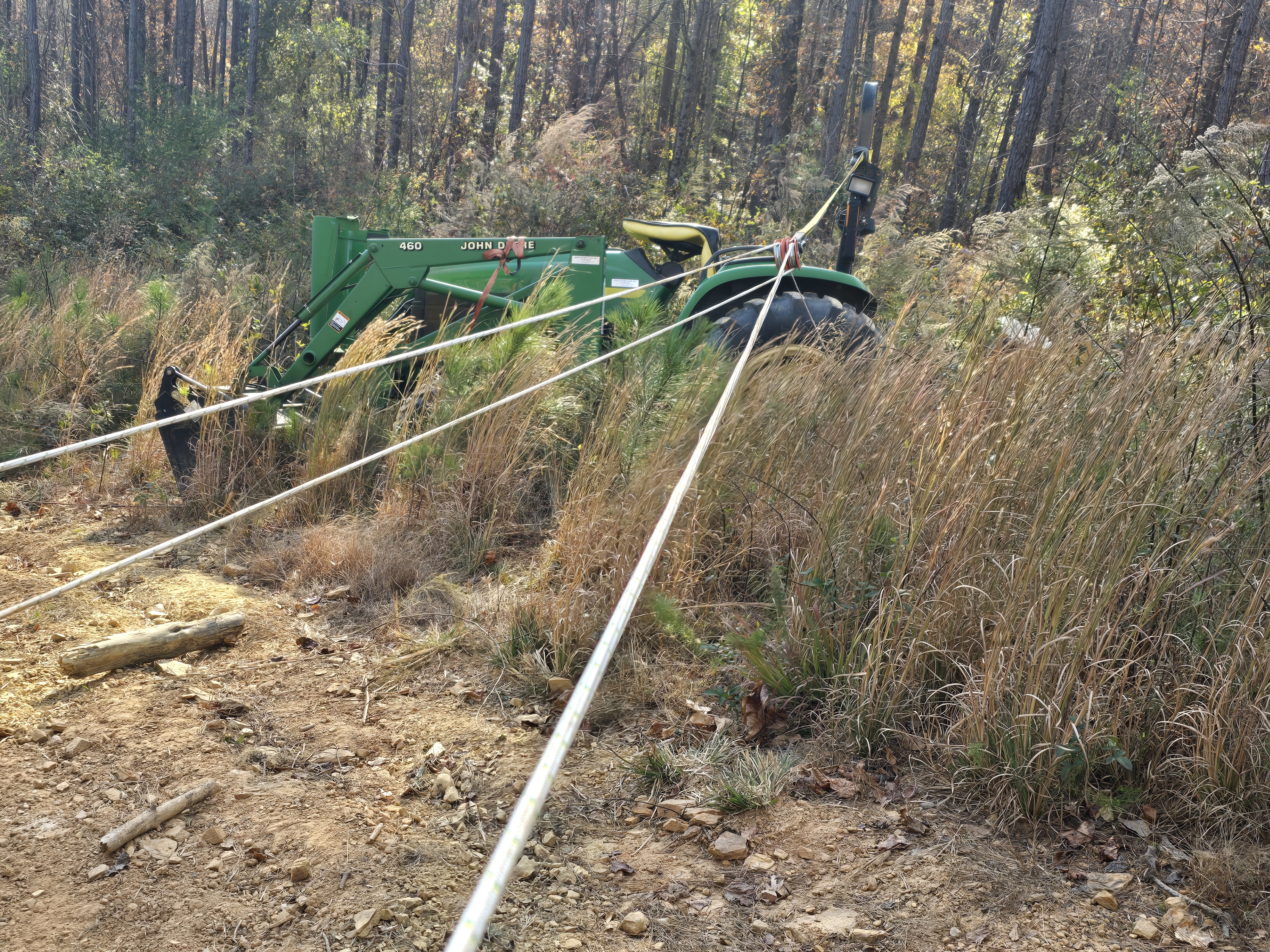 I'm glad you're making progress. Keep a few straps on the uphill side of the tractor until you get it in the clear.