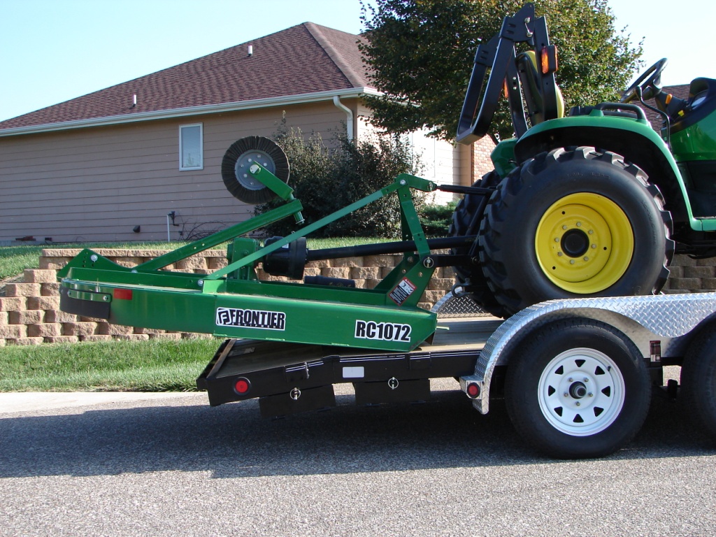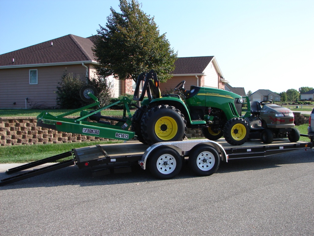 Looks exactly like my P+J trailer; I also fold up the tail wheel. The problem that I ran into was: if my mower was level like yours, when the front of the tractor started up the ramps, the rear-most part of the mower would hit the ground/pavement; even with it raised. By shortening top link, it lifted the rear of the mower about 9" higher than the front. When I raise the 3-pt, the rear of the mower is more than 9" higher. Now, as the tractor drives up the ramps, it doesn't drop the rear into the ground. VISUAL: take a look at your picture. Leave the front of the mower touching the trailer, and raise the remost part of the mower about 9" by shortening the top link. This really helps with the visibility of the trailer lights also.