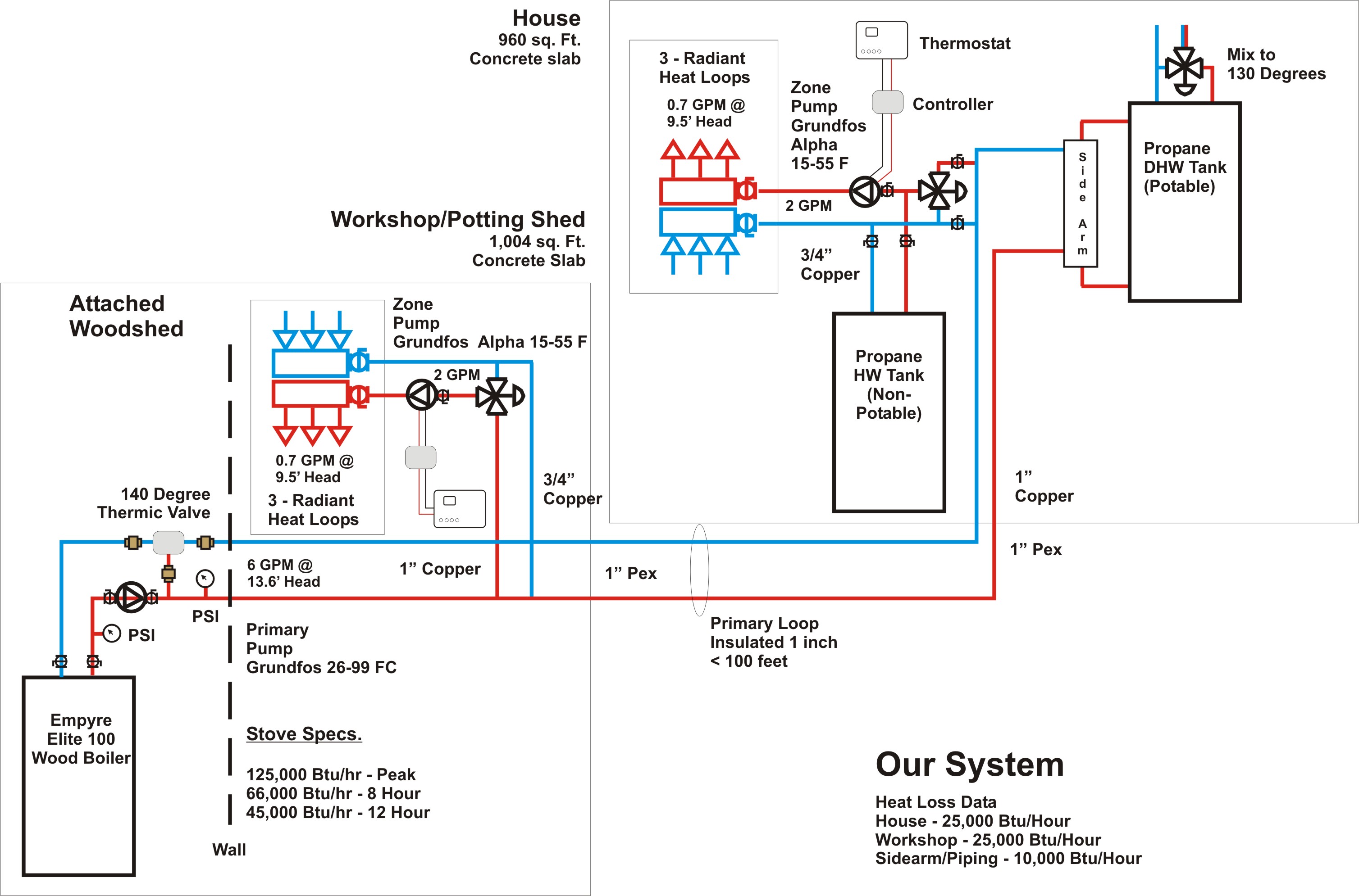GRUNDFOS 2699 FC pump feeds a 1" Pex main loop from boiler to house to a sidearm exchanger and back to workshop with 6 GPM/13.6' head loss. After the sidearm, secondary loop (close "T's) feeds a GRUNDFOS Alpha pump with 2 GPM/ 9.5' head loss.