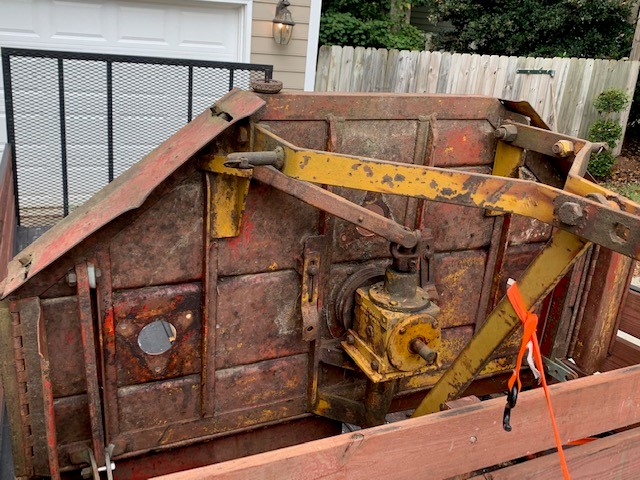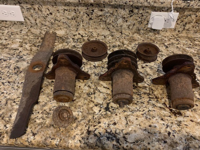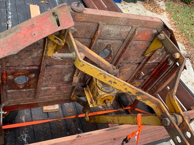 Picked up an old finish mower. 5'. Deck is solid, but hubs/spindles are shot. Hinged flaps on sides/rear. 3 spindles and 2 pulleys. Managed to get all rusted parts off with grinder/torch. Gearbox seems solid.
