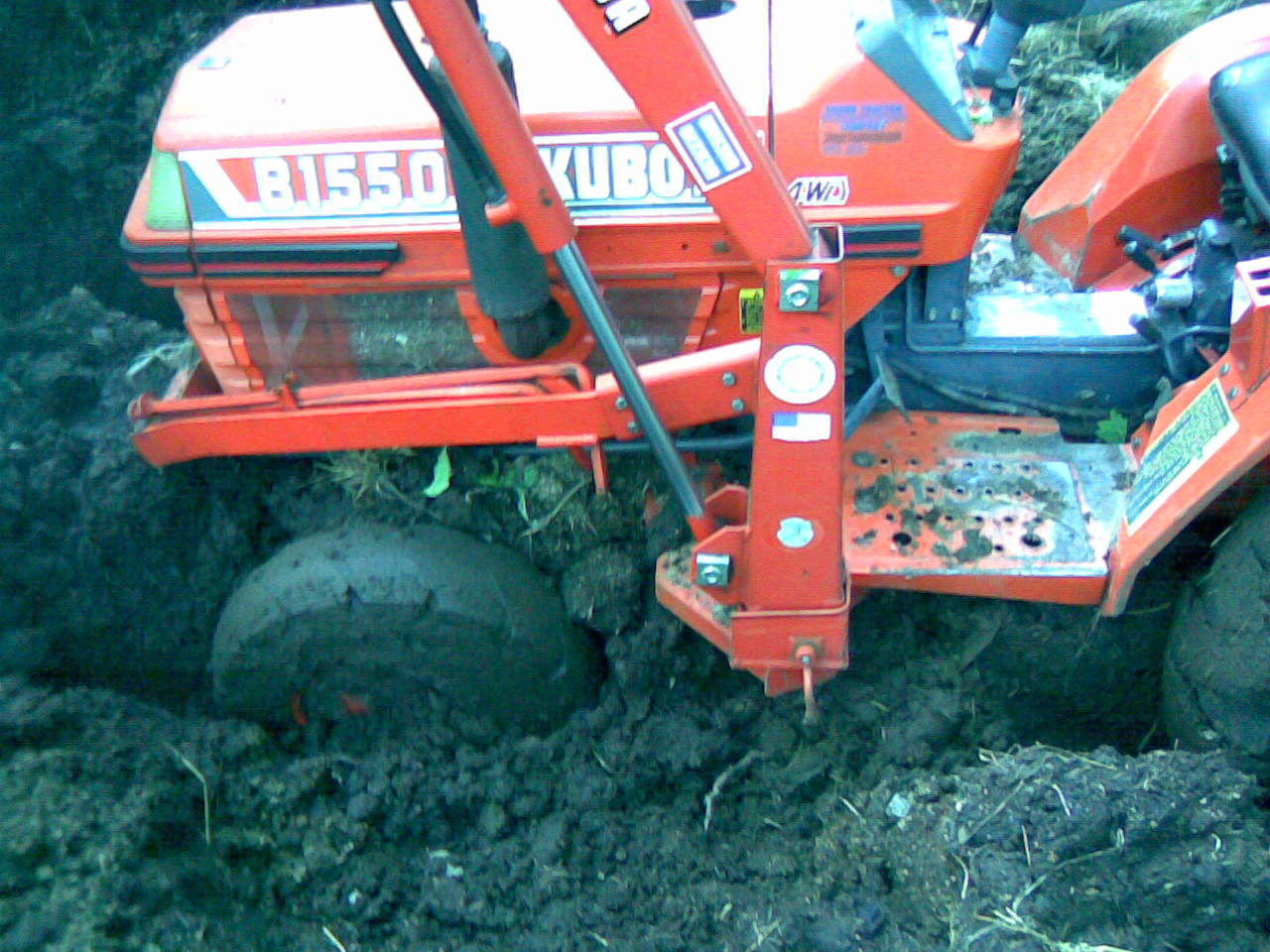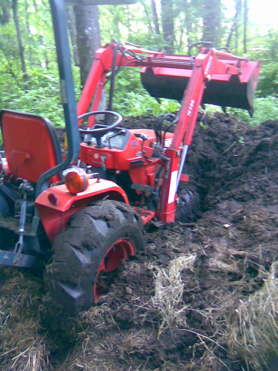Well...he doesn't actually know:) He had to run an errand and we pulled his tractor out while he was gone. In defense of his little Kubota, the s*** was really deep and squishy. He probably didn't realize just how soft it was until he was (literally) in deep doo doo. We've gotten our 2320 stuck before up to the axles in mud and it's no fun. It's surprisingly easy to underestimate the suck factor of mud.