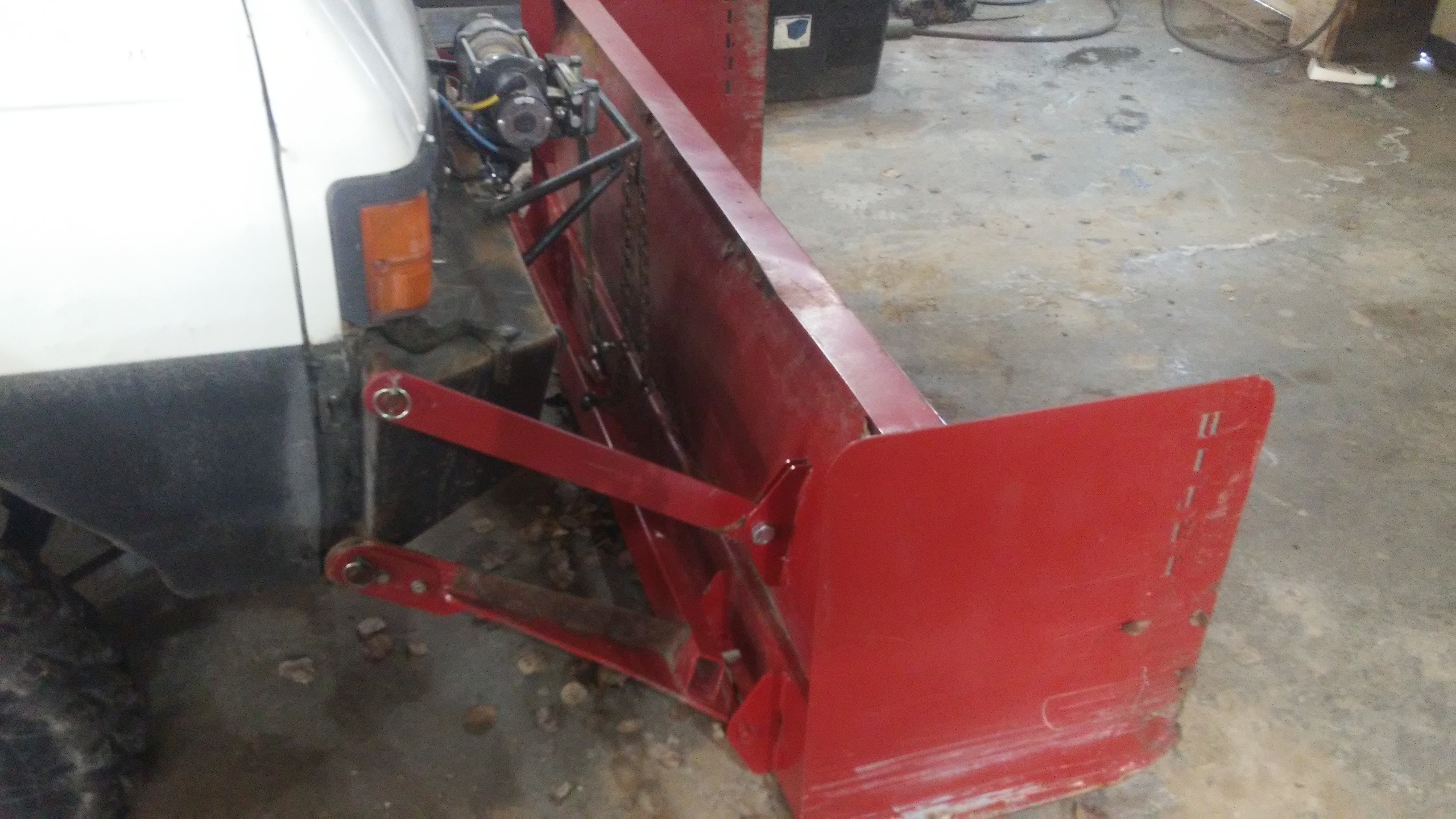 The issue I see with this design is the steep angle of the pivot arms during plowing. Most plows have the framework straight back to the vehicles frame during plowing and angled up during transport. The OP has the framework highly angled during plowing and more straight when transporting. When hitting an object or pushing heavy snow, the plow will be forced down and the vehicle up. If the OP has these issues during plowing, the fix should be fairly easy to remedy.
