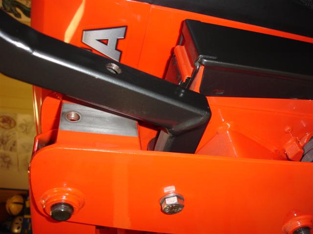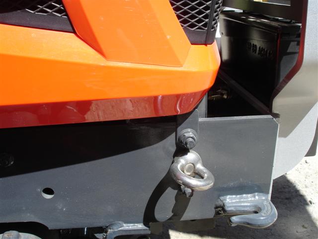 The hitch assembly mounts to these two stainless tabs under the starboard FEL arm for storage