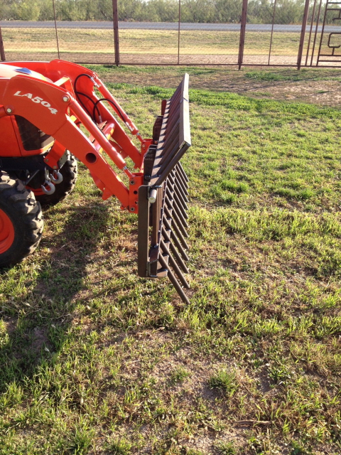 Since those photos have been posted I have put expanded metal in the center of the middle and top sections (in front of the tractor radiator). I also put skid shoes on the outside of the rake. I have used it to push up weed overgrowth and small mesquite trees that we grubbed using a backhoe. It works quite well. The down side is the thorns play **** with the tires. I have lost all of my winter air in the fronts. I am a bit more careful now.