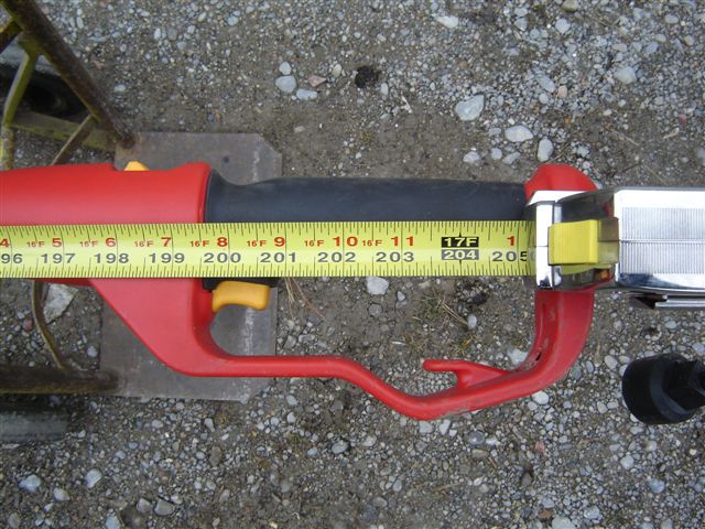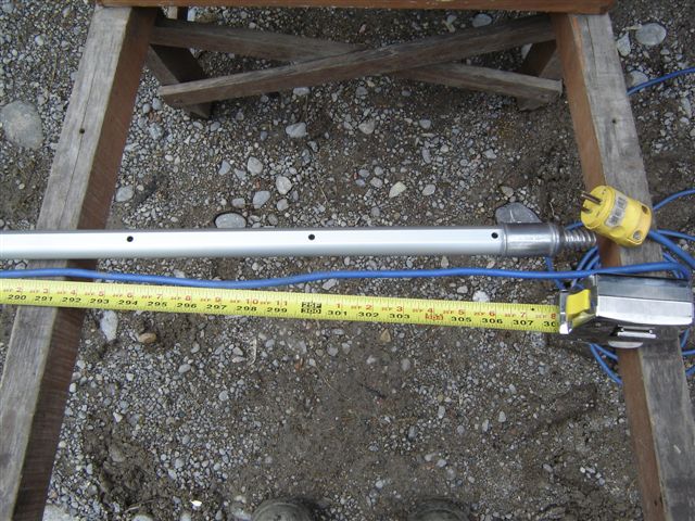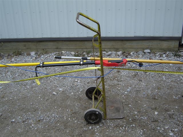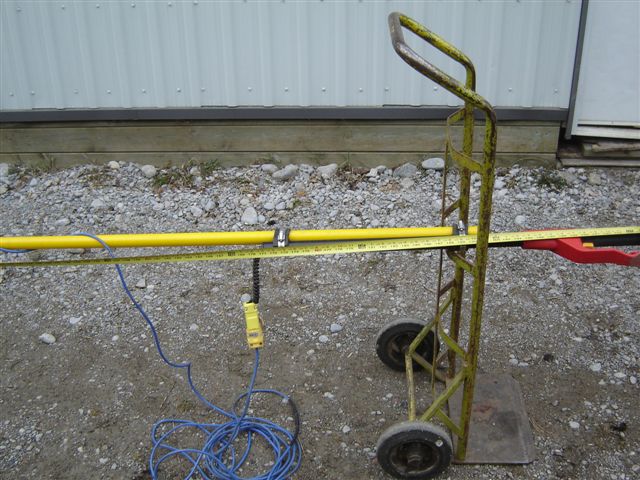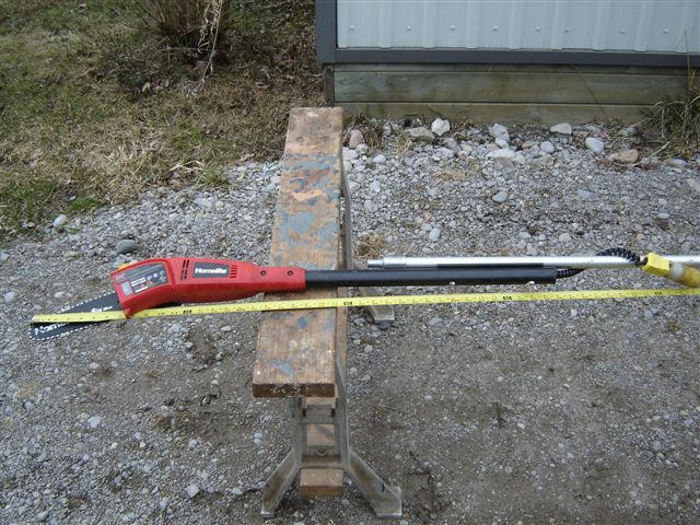 The following are pictures of a electric pole saw that has cut branches at the 24' level. If you are wondering why I have this in a tractor site it is because we all have long drives. This is prototype #3, #1 used the extension pole with a recipating saw but it was too slow. #2 was a 12" electric chain saw on a wooden pole too heavy, and way too much power.
