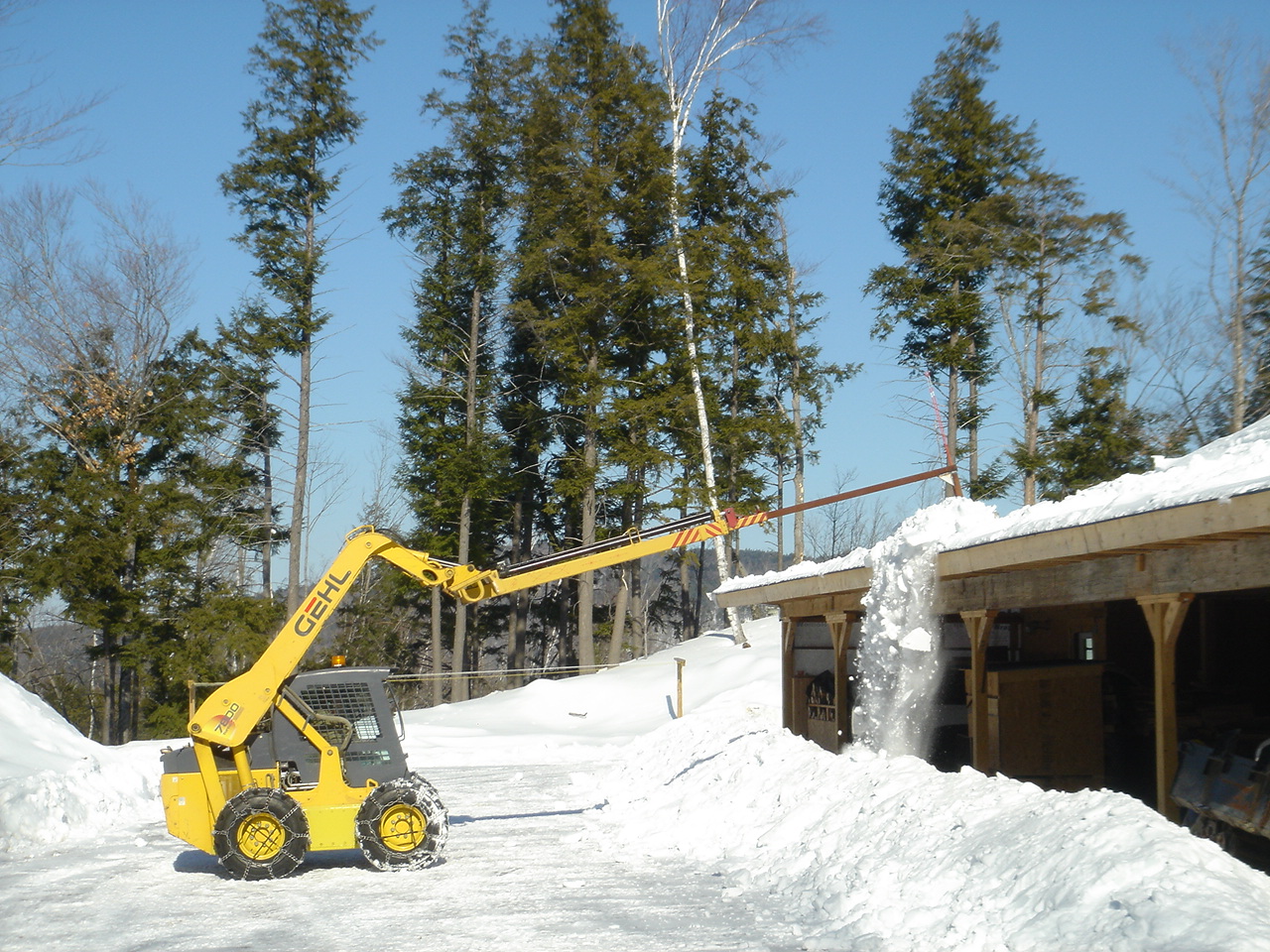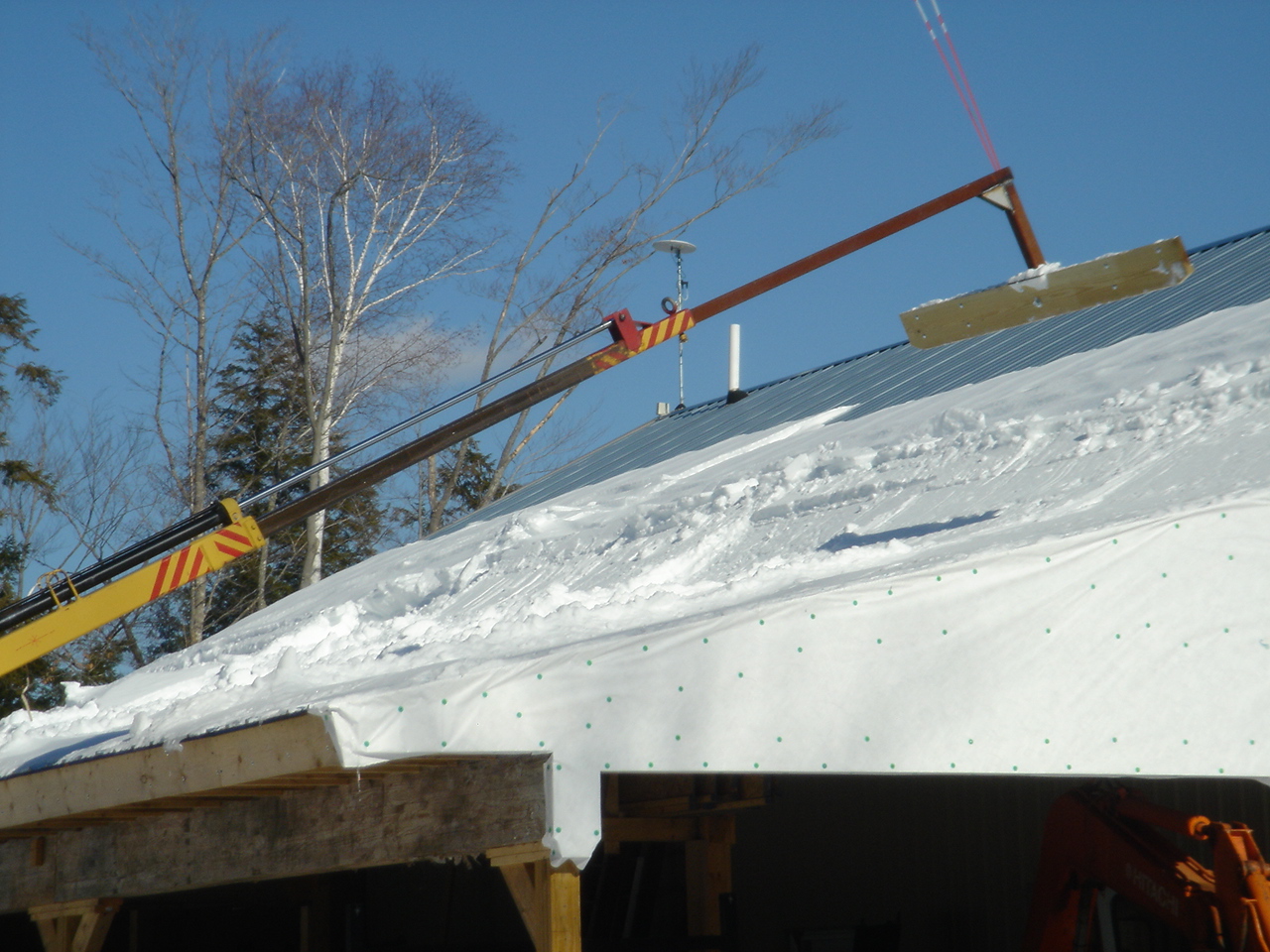 I built this jib pole out of some stuff laying around a few years back. It'll reach about 30' (straight up) on the SS with the arms up. There is about an 8' cly. to make it telescope out. The outside is a 6X6X.25 tupe with a 4X4X.375 inside it with some slides I made up to acommodate the inside dimensions. I did the "snow rake" attachment after I put that "lean to" on the back of the shop. The blade is a 2X10 p.t. on a steel backer and it can swivel some to accommodate the machine not being level with the roof. It does not harm the metal roof, but I am very careful! Snow just will not come off a 3/12! The end of the pole is built like a large (4") reciever hitch, I can slide in & pin different end configurations for lifting. Sorry no pics of it on the tractor.