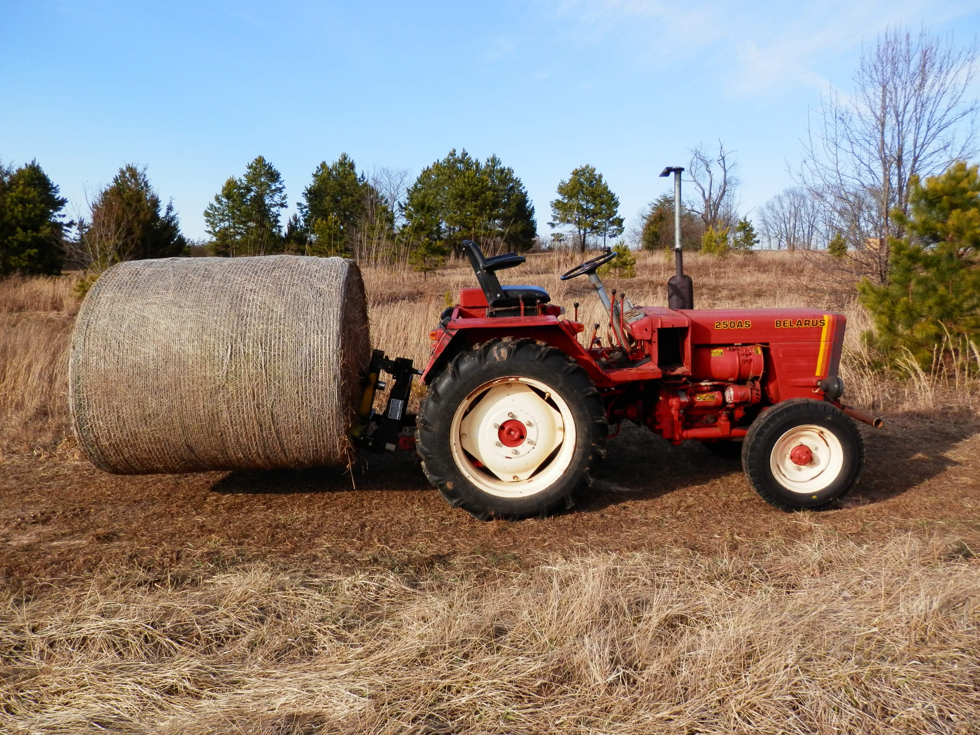 Take a look at this Youtube video of the foldable hay spear. Grant it, this tractor model is smaller than mine, but the hay spear attachemnt is a good size. Only two long spears are needed to fork the big round bale.