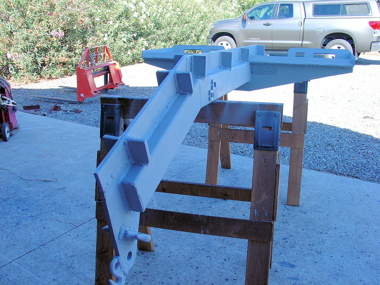 In the background of one of your pictures you have a fork frame,did you build that? The reason i ask is i have a store bought one and the frame is at a 90 degree angle to the forks where yours is kicked out on the bottom. Thats a good thing because i can only angle my forks back a few degrees at lower heights, I would advise anyone looking at forks to consider this.