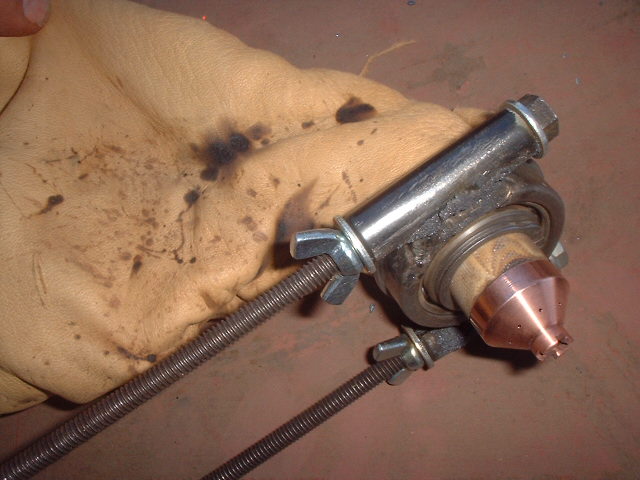 Also greatly affecting the quality of cut is the electrode and nozzle condition. They gradually erode from normal use and eventually they cause the plasma jet to become unfocused and even spray out in a diagonal smear. At that point (or sooner if you want the best quality cut) the consumables need to be replaced.