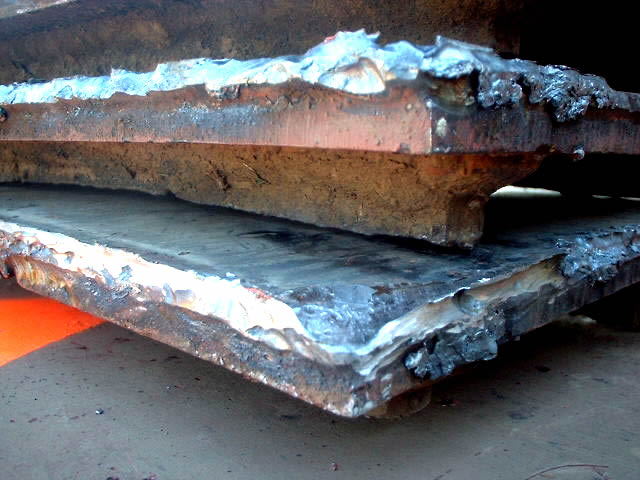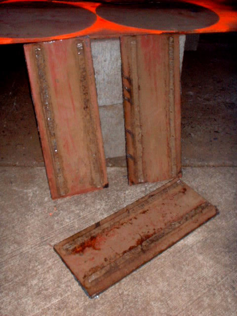 I've attached here a picture of three steel plates that I removed from the bottom of this plate today. They are about six inches by seventeen inches, half inch steel with some cuttoff ends on the surface. I was really kind of worried that these would be real tough, wasn't entirely sure what I was going to do because they were attached with good fat weld beads all the way around on all four sides. But today I decided I would try gouging out the welds and see if I could remove one. I used the same technique that I had used on the angle iron, except that getting the chisel started was a bit harder because of the continuous welds. But once I got it started, they came off pretty easily. Once I got a quarter inch gap, I saved some time by putting in a large pry bar and whacking it with a sledge. At that point it went pretty quickly. Once you've gouged out the bulk of the welds, they don't have much strength.